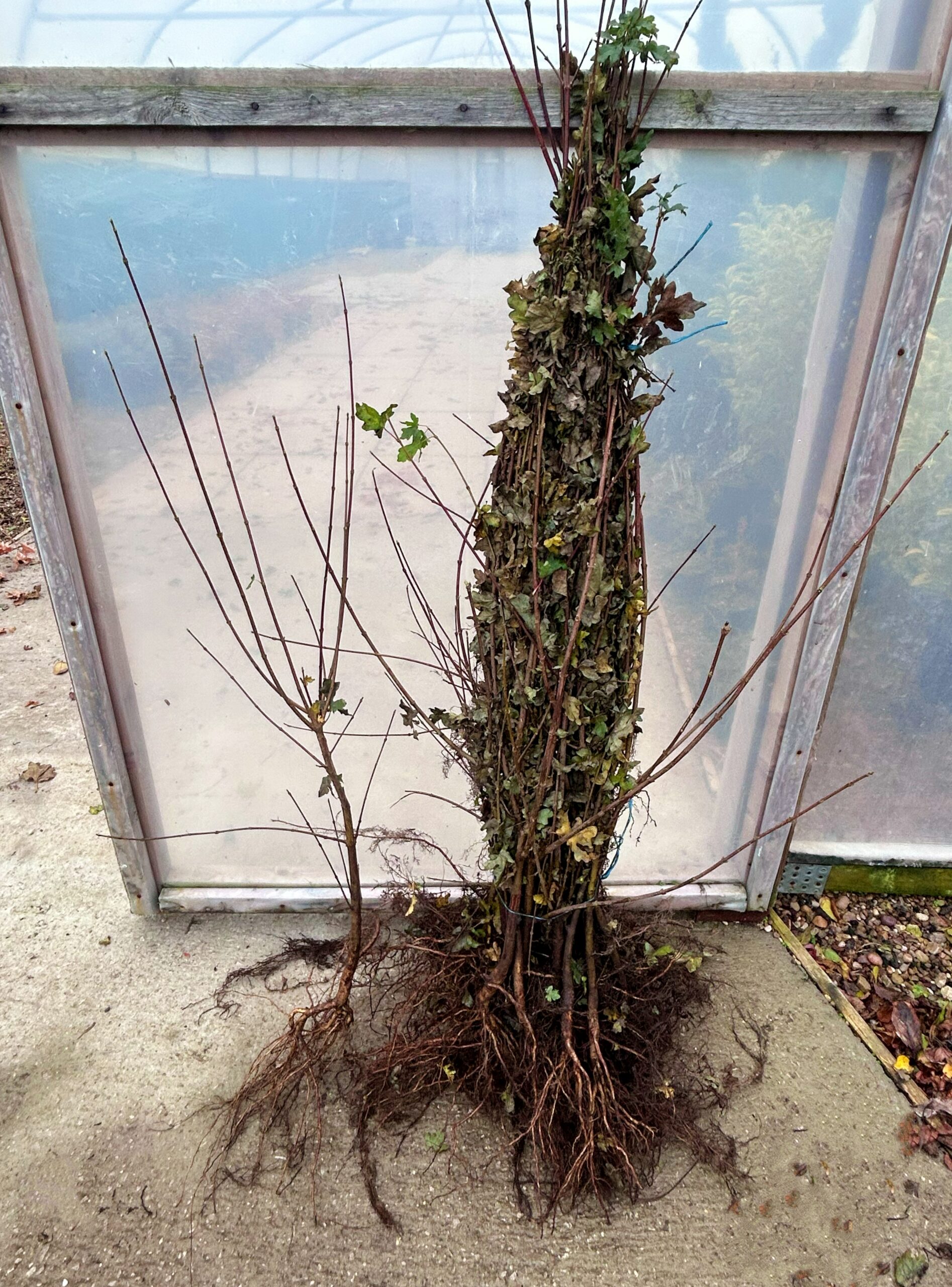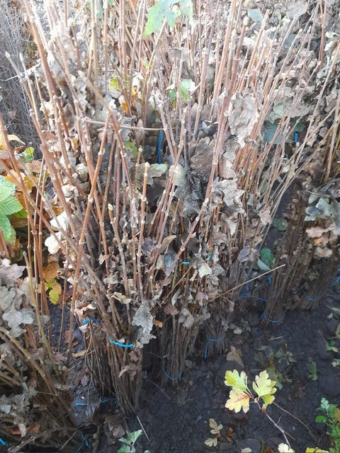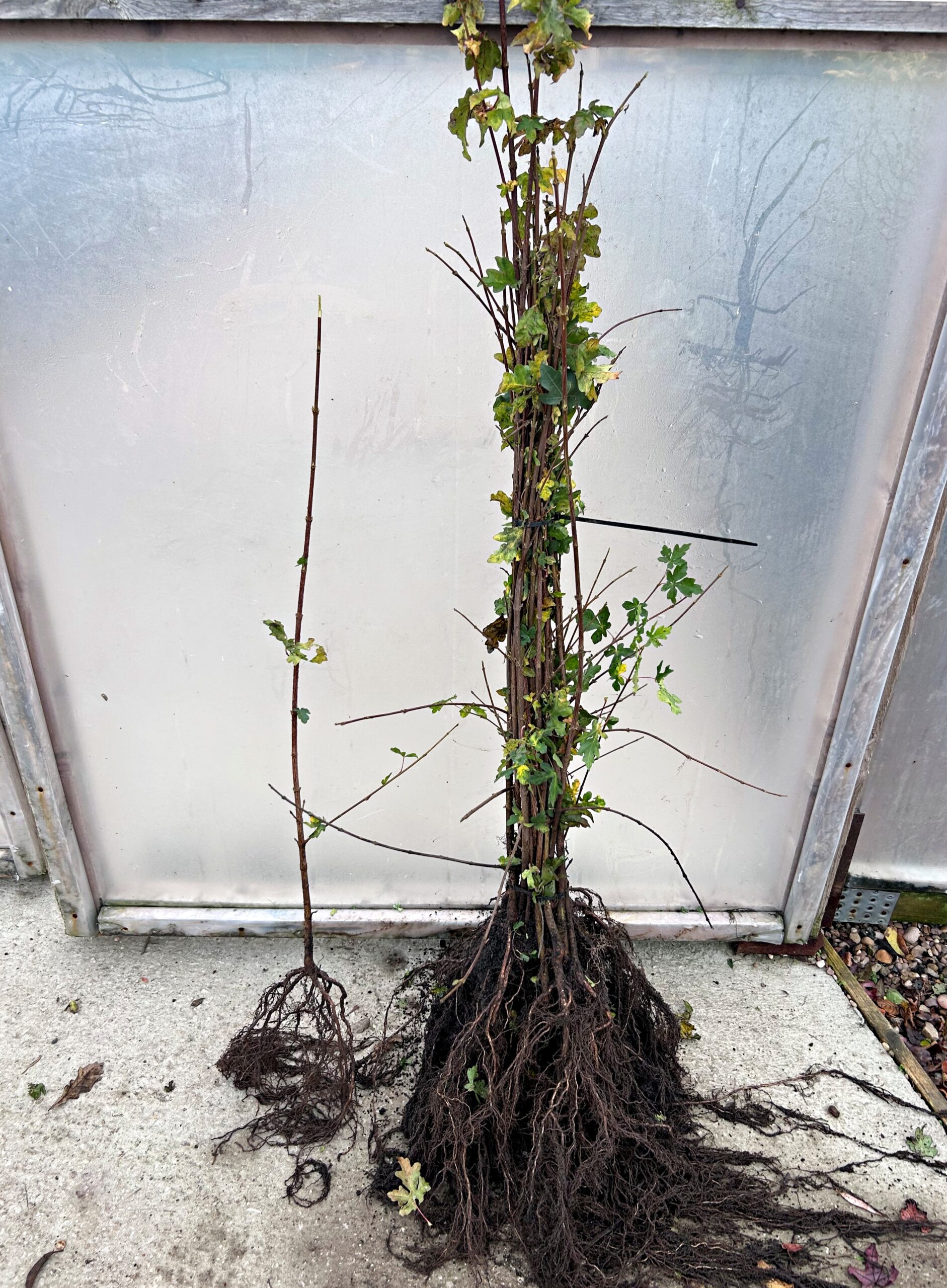 1+1 A two year old plant grown from seed in the first year and then transplanted from the seed bed into a different area of the field, and spaced out for the second growing season, which produces a robust plant with a larger, more robust root system that the 1+0 or 1U1 plants, thereby enabling it to more easily withstand drought and weed competition. A good choice for farm hedging.