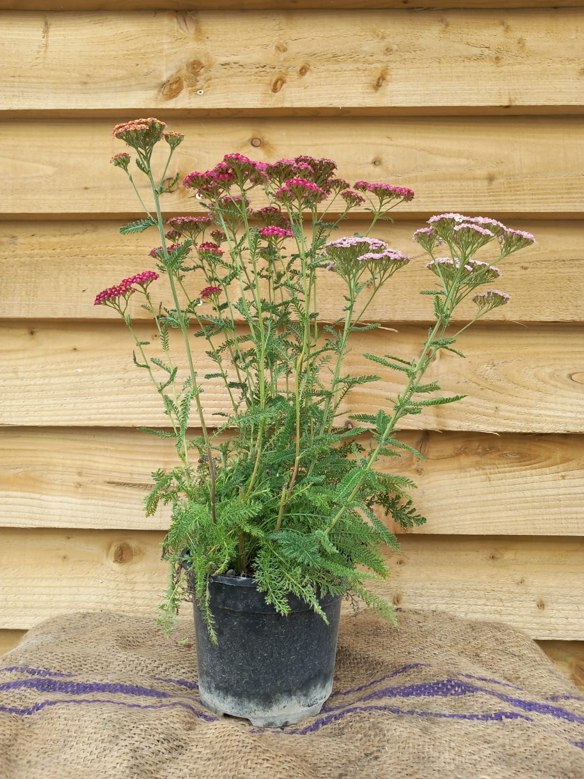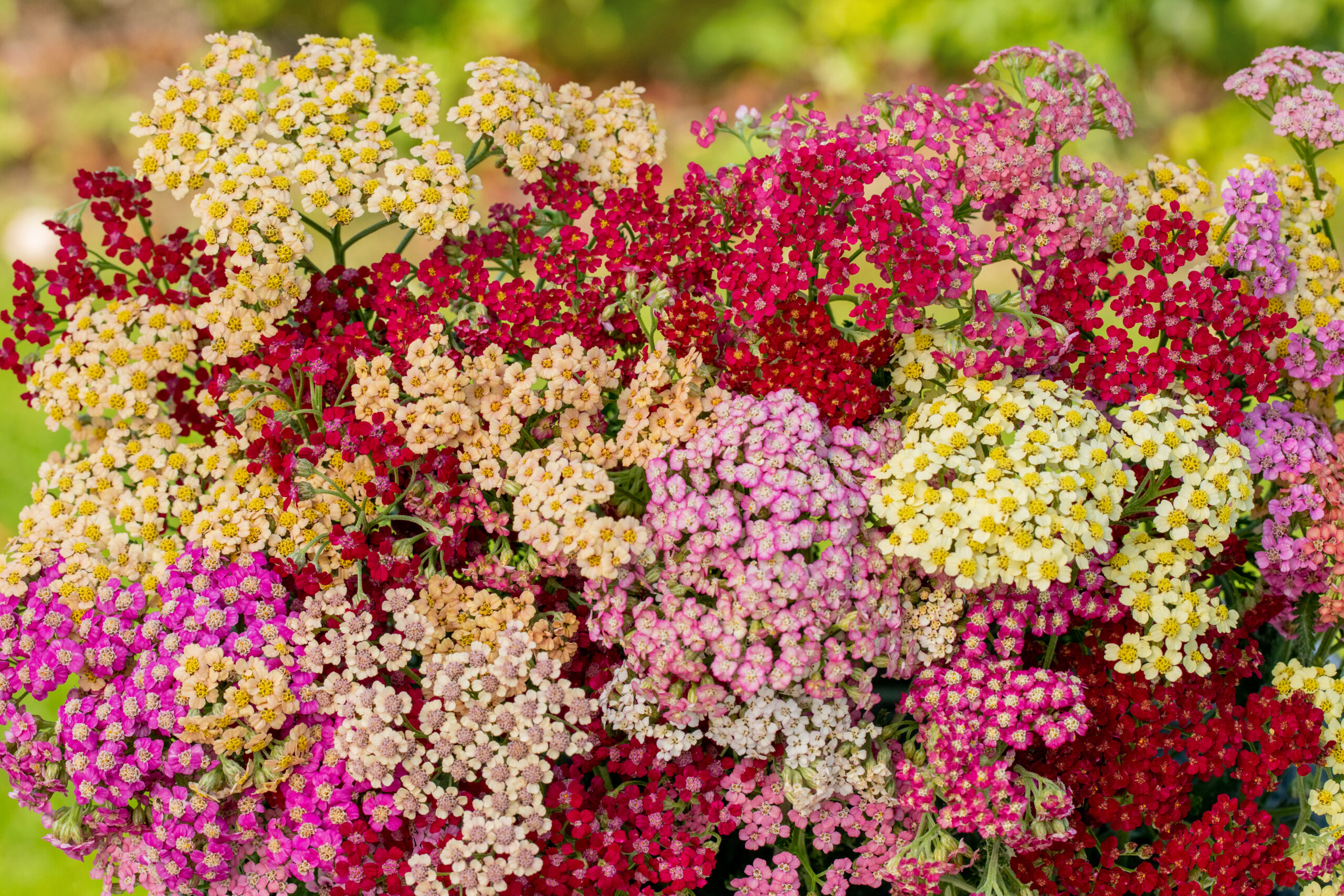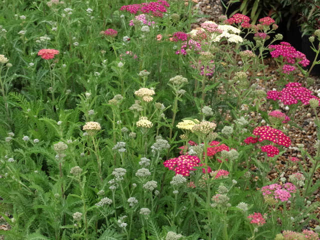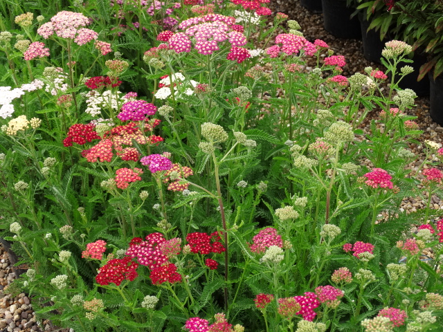 A compact, mat-forming semi-evergreen plant with fern like, grey-green, aromatic foliage, and numerous flat-toped flower heads in shades or red, pink, orange, yellow or white. Thrives in moist, but well drained soils, in sun or partial shade. Ideal as cut flowers. Hardiness rating is H7.