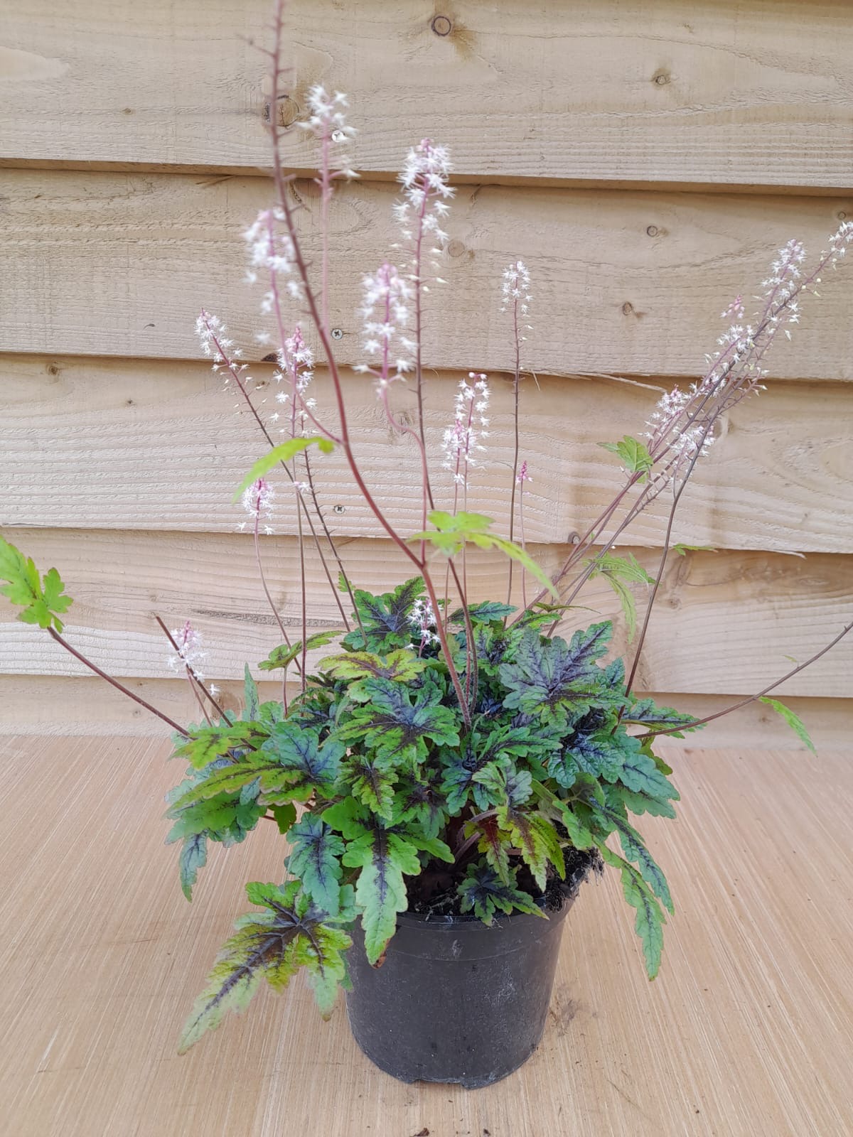 A compact evergreen or semi-evergreen perennial up to 35cm high. Palmate, lobed and tiered palmate mid-green leaves have striking, dark-brown central markings. Small, pale-pink flowers are produced from spring to early summer, clustered along each flower stem, giving a frothy, wand-like appearance. Plant in moist, well drained soil in full or partial shade. Protect from excessive wet in winter. Hardiness rating 7.