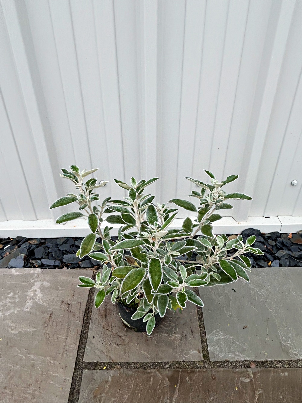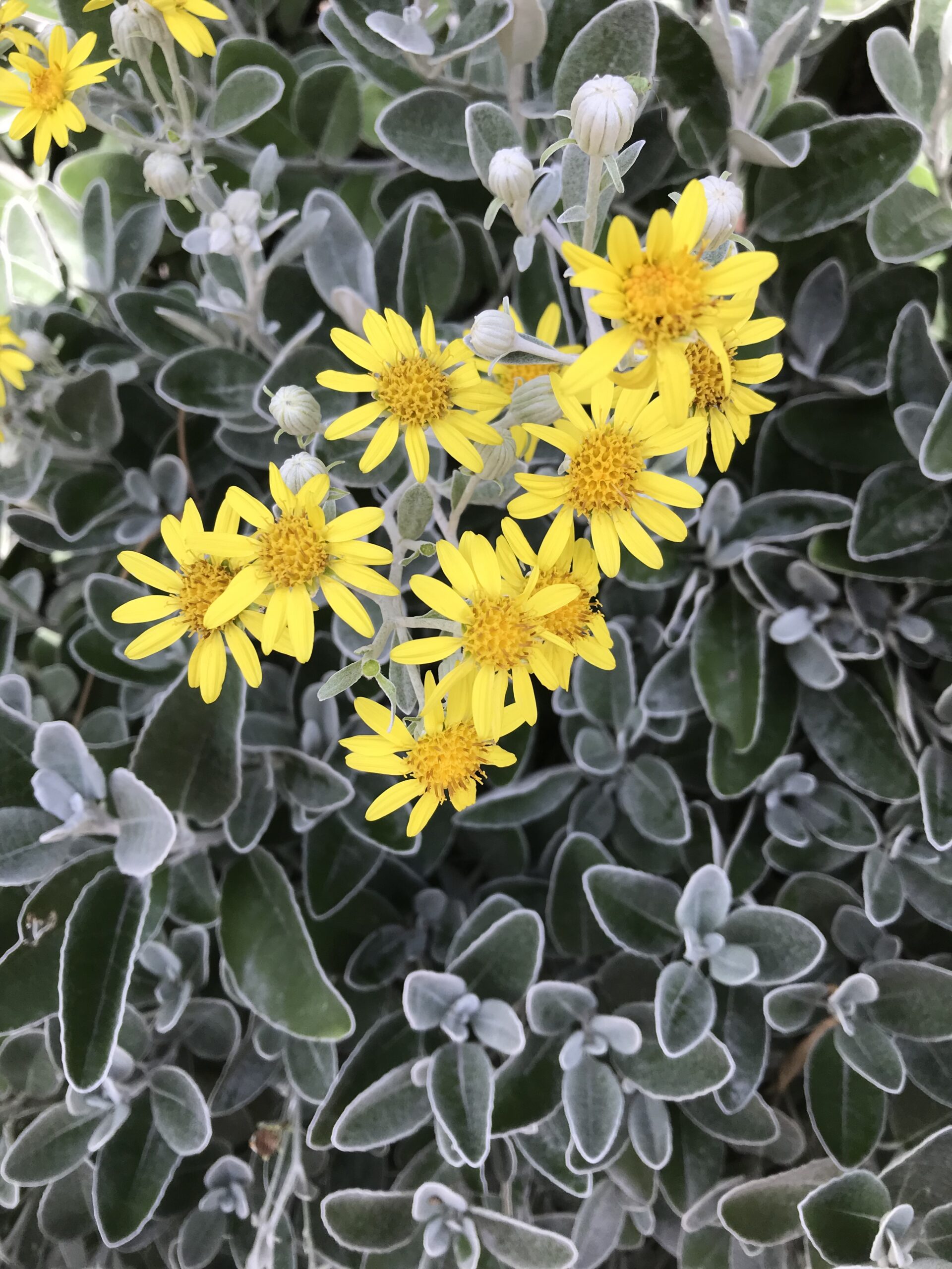 An evergreen, mound-forming, spreading shrub Up to around 1-1.5m, with oval leaves that open covered in white felt, and mature to dark green on the upper surface. Large clusters of bright yellow daisy like flower heads are produced from early to mid-summer, and are attractive to bees and other pollinating insects. Plant in moist, well drained acid, alkaline or neutral soil in full sun. Will tolerate drought conditions once established. Hardiness rating H4.