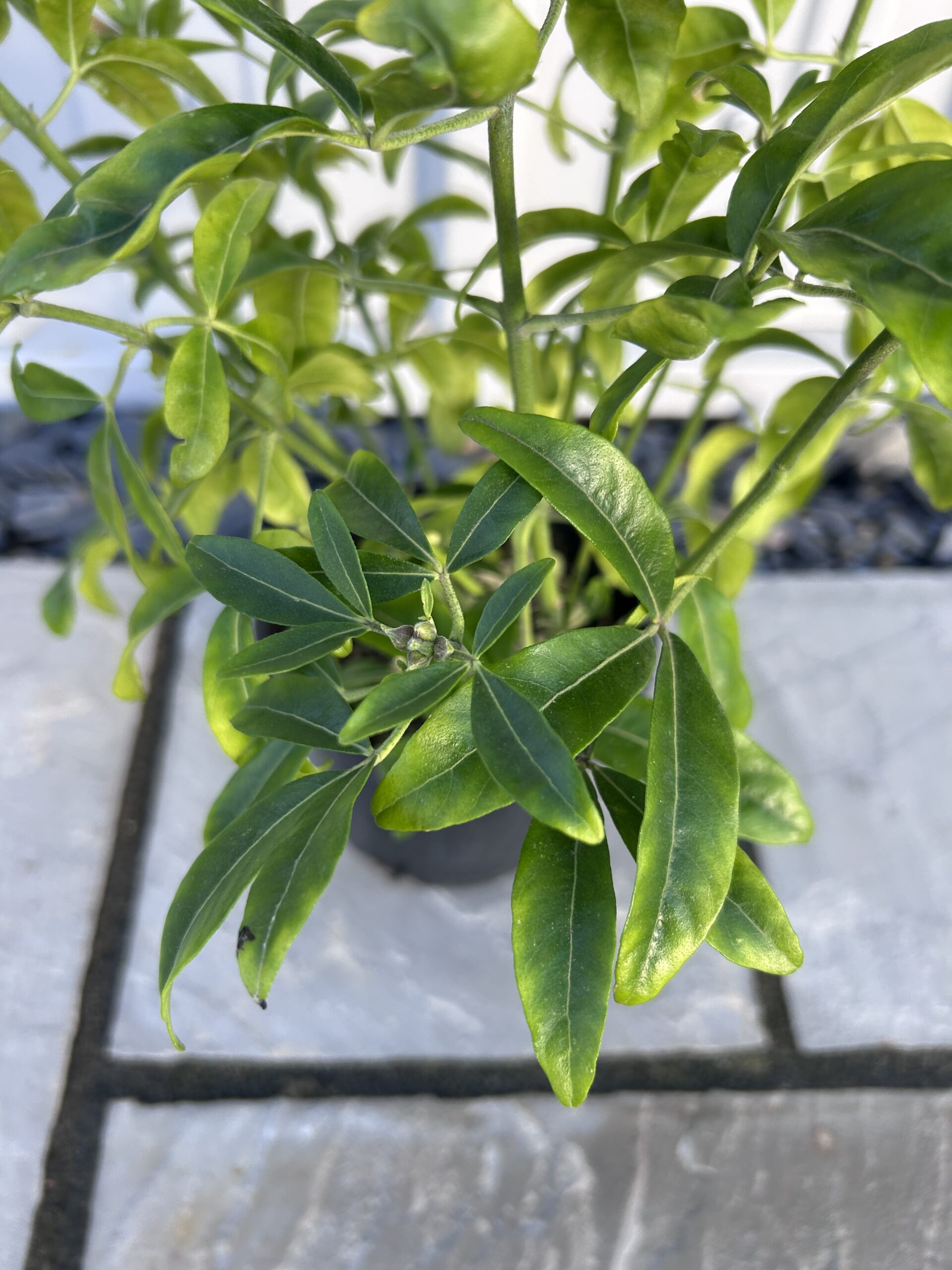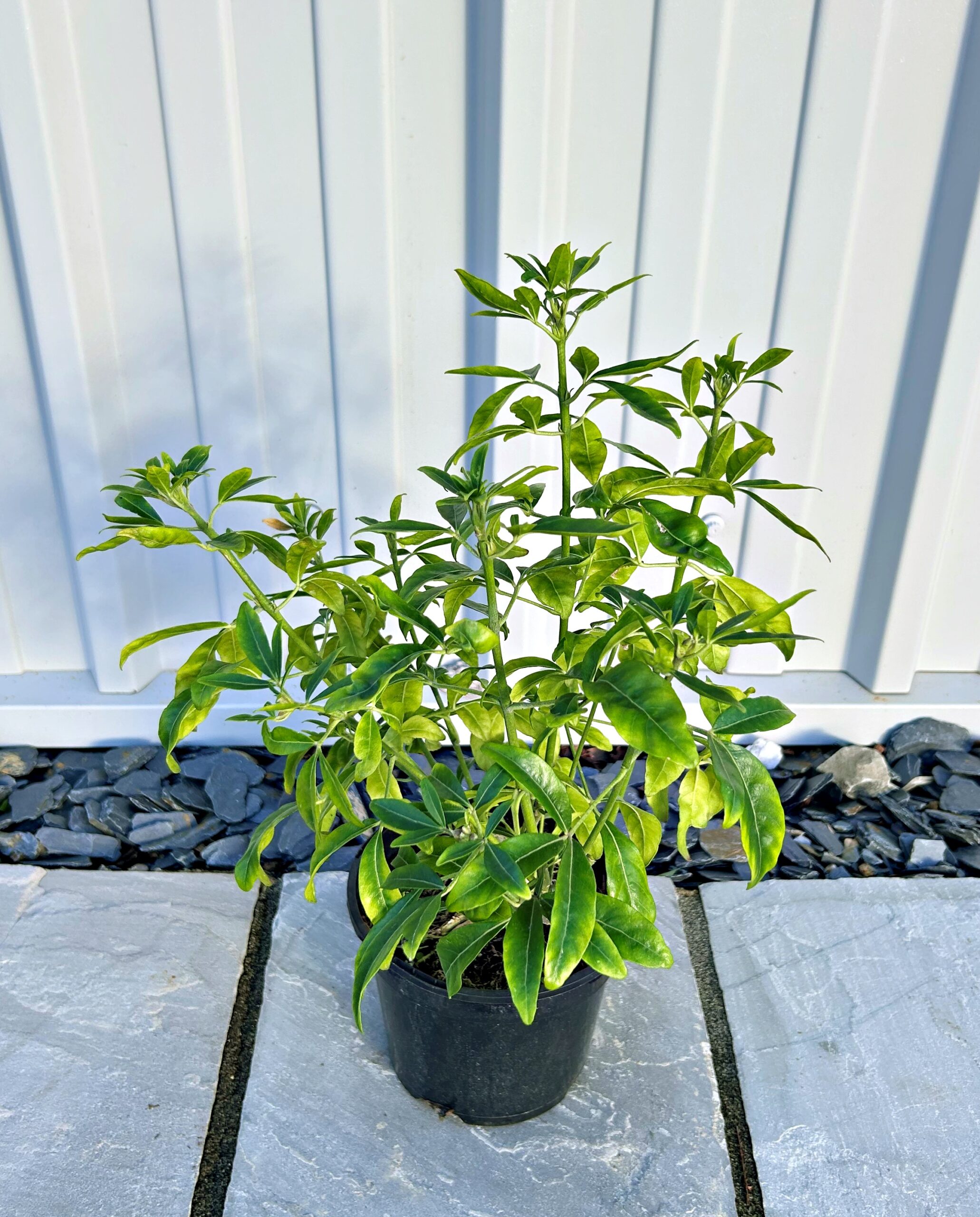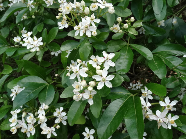 Choisya ternata ‘Mexican Orange Blossom’ - An evergreen, medium-sized shrub of rounded habit.   The shining dark green leaves are aromatic when crushed.   Sweetly scented white flowers are borne in clusters of up to six throughout late spring and early summer, and usually flower again in autumn. Hardiness rating is H4.