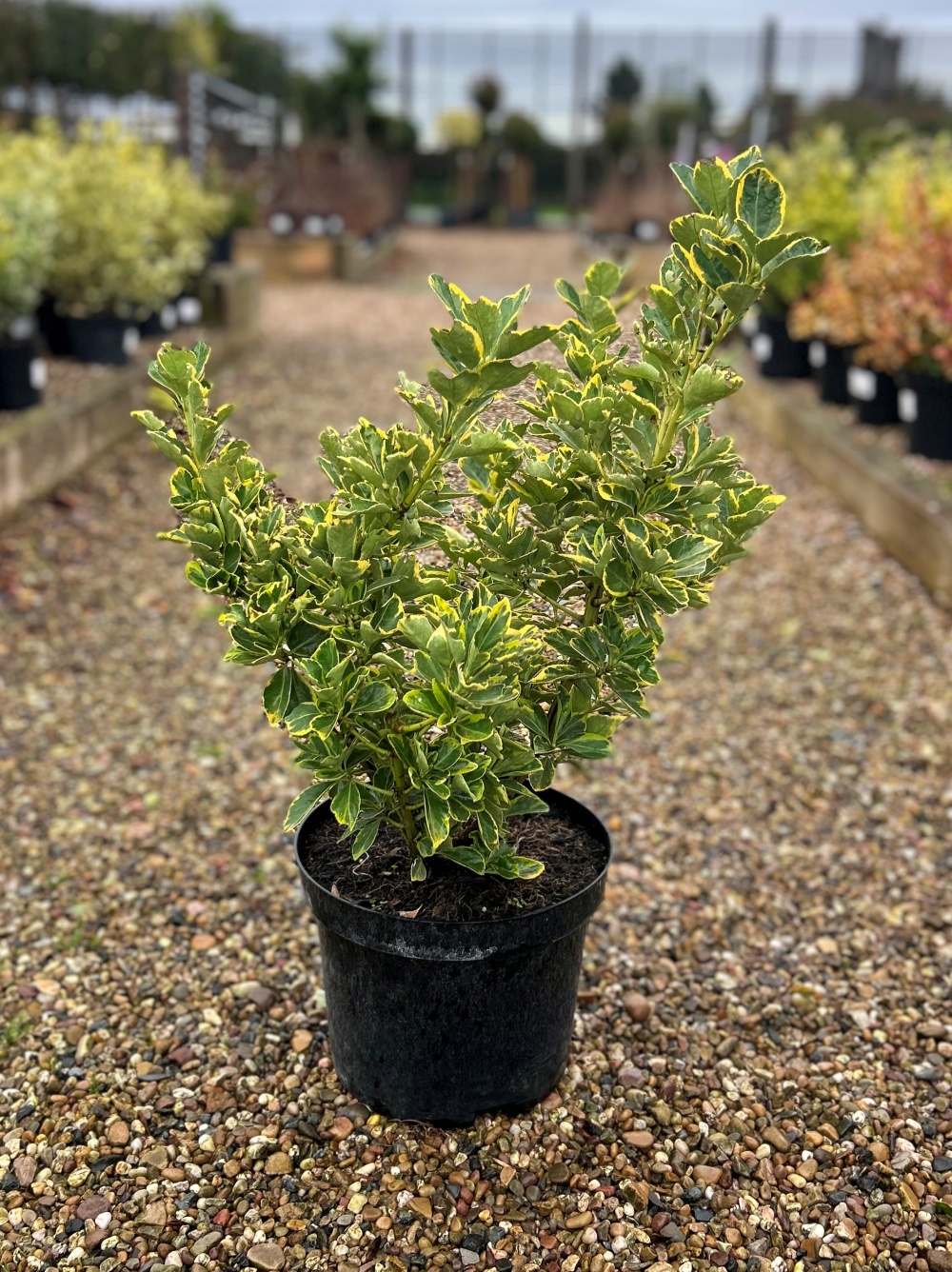 Euonymus japonicus ’Aureus’ Japanese spindle:  An evergreen shrub with dark green glossy leaves, with a central gold mark.   Makes an ideal small hedge, growing between 1m and 1.5m in height.   It will brighten any border and requires minimal maintenance.   It is resistant to coastal and windy conditions and responds well to pruning.   Plant in moist, well drained acid, alkaline or neutral soil in full sun or partial shade.   Hardiness rating H5. At certain times of the year the trees and plants that you buy from us may not look like the images shown on our website, this may be due to deciduous leaves falling, or the plant finishing flowering. All photographs on our website are of our own grown stock, or in the case of Italian specimens, these are photographs of the plants actually in stock.