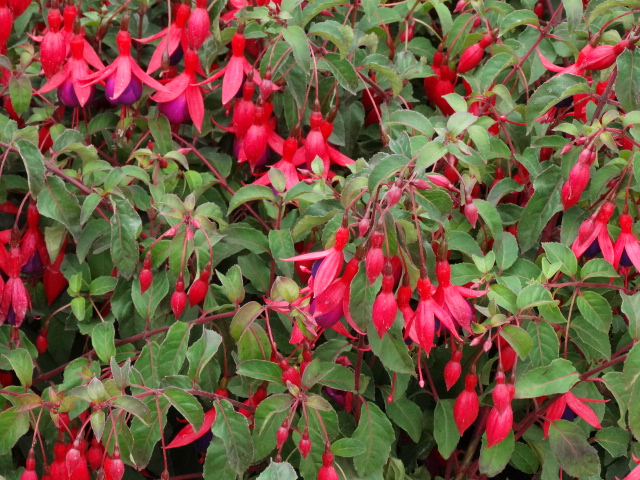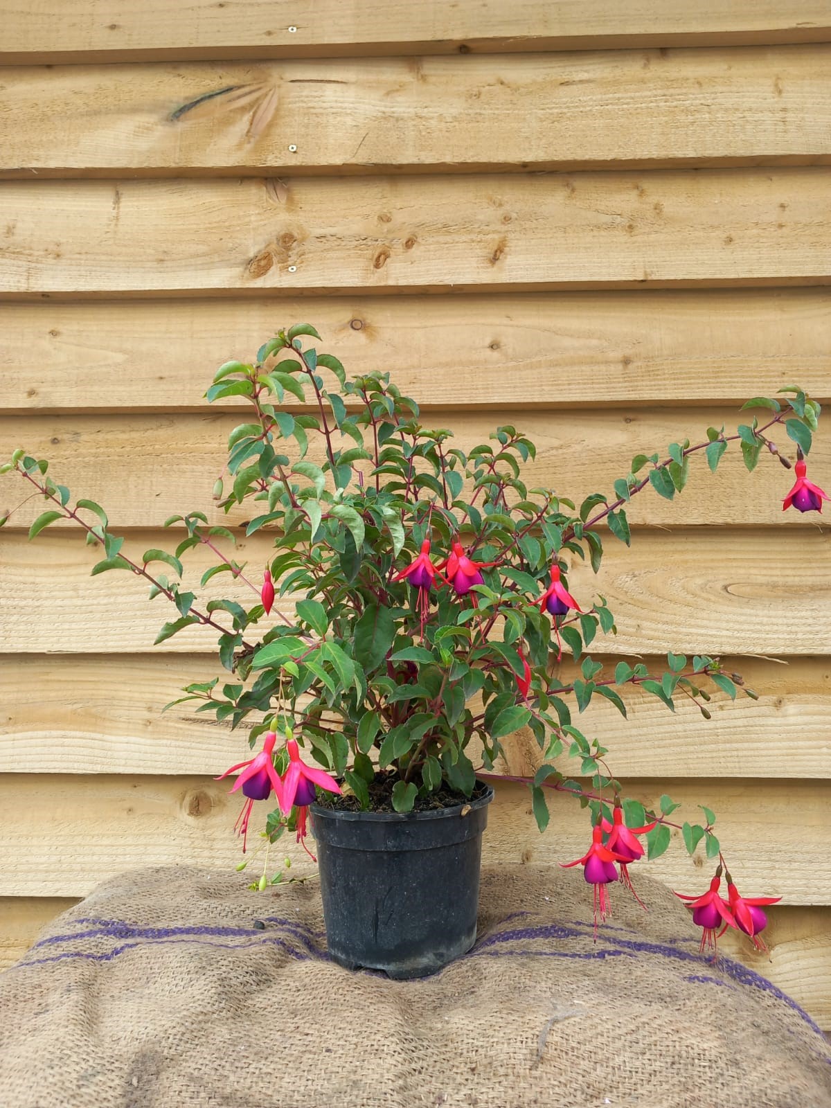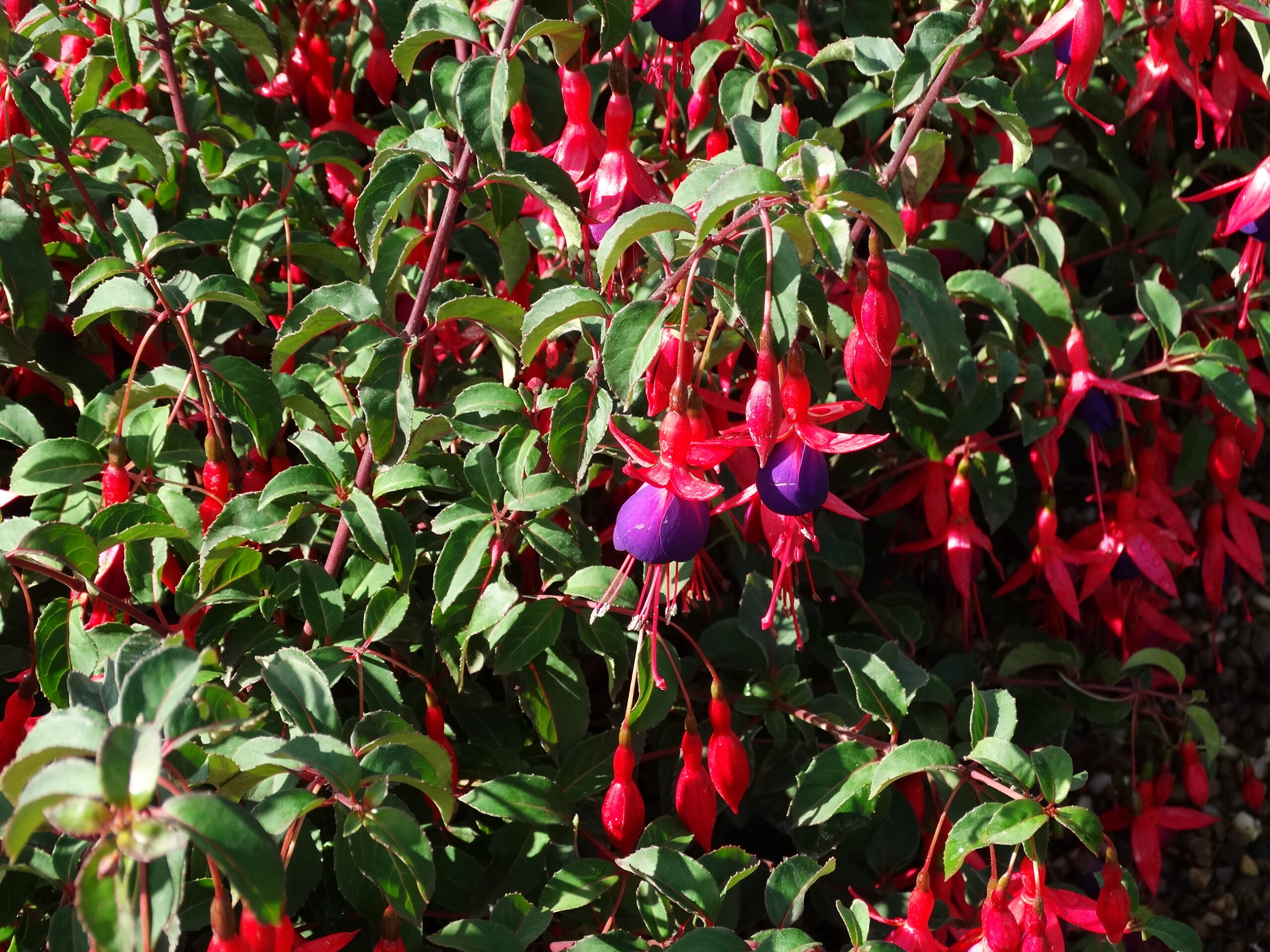 A small, large-flowered, hardy, vigorous shrub up to about 1m tall, with small, dark green leaves. Flowers with spreading, scarlet sepals, violet petals, and long protruding crimson stamens, are produced very freely throughout the summer and autumn. Plant in any moist, well drained soil, in full sun or partial shade. Plant base of stem 5cm below ground level and protect from cold, drying winds. Hardiness rating 4.