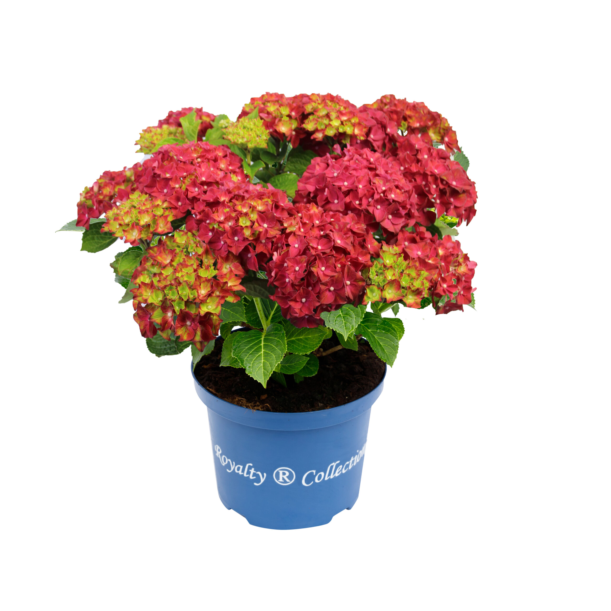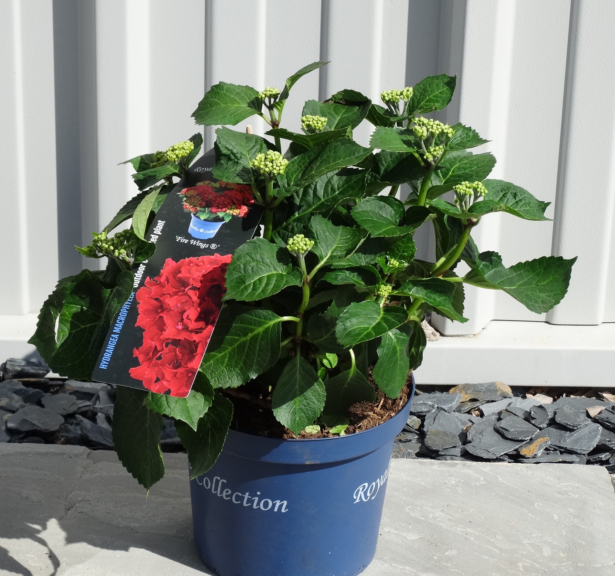 Hydrangea macrophylla ‘Fire Wings’ – Part of the Royalty Collection A new variety of hydrangea, a small and compact, deciduous, hardy shrub with glossy green leaves.   The mophead florets open green, turning to globular heads of florets with green centres and deep red edges, finally changing to completely red florets during summer and autumn, so no two blooms are the same.  Thrives in moist fertile acid, alkaline or neutral soils, in full sun or partial shade.   Suitable for planting in pots, baskets and borders.   Remove old flower heads in spring to encourage abundant flowering.   Water frequently.   Hardiness rating H5. At certain times of the year the trees and plants that you buy from us may not look like the images shown on our website, this may be due to deciduous leaves falling, or the plant finishing flowering. All photographs on our website are of our own grown stock, or in the case of Italian specimens or bare root hedging, these are photographs of the plants actually in stock.