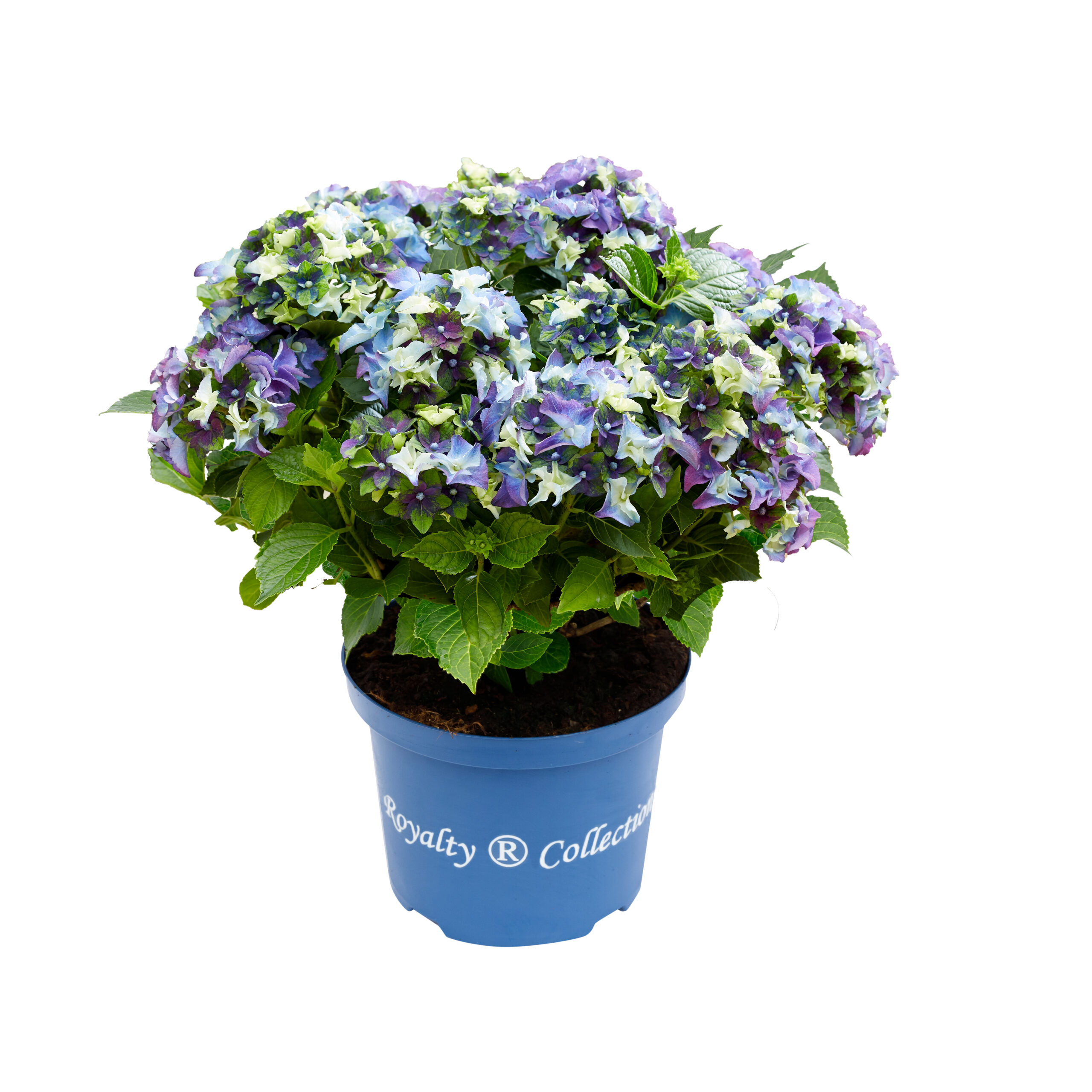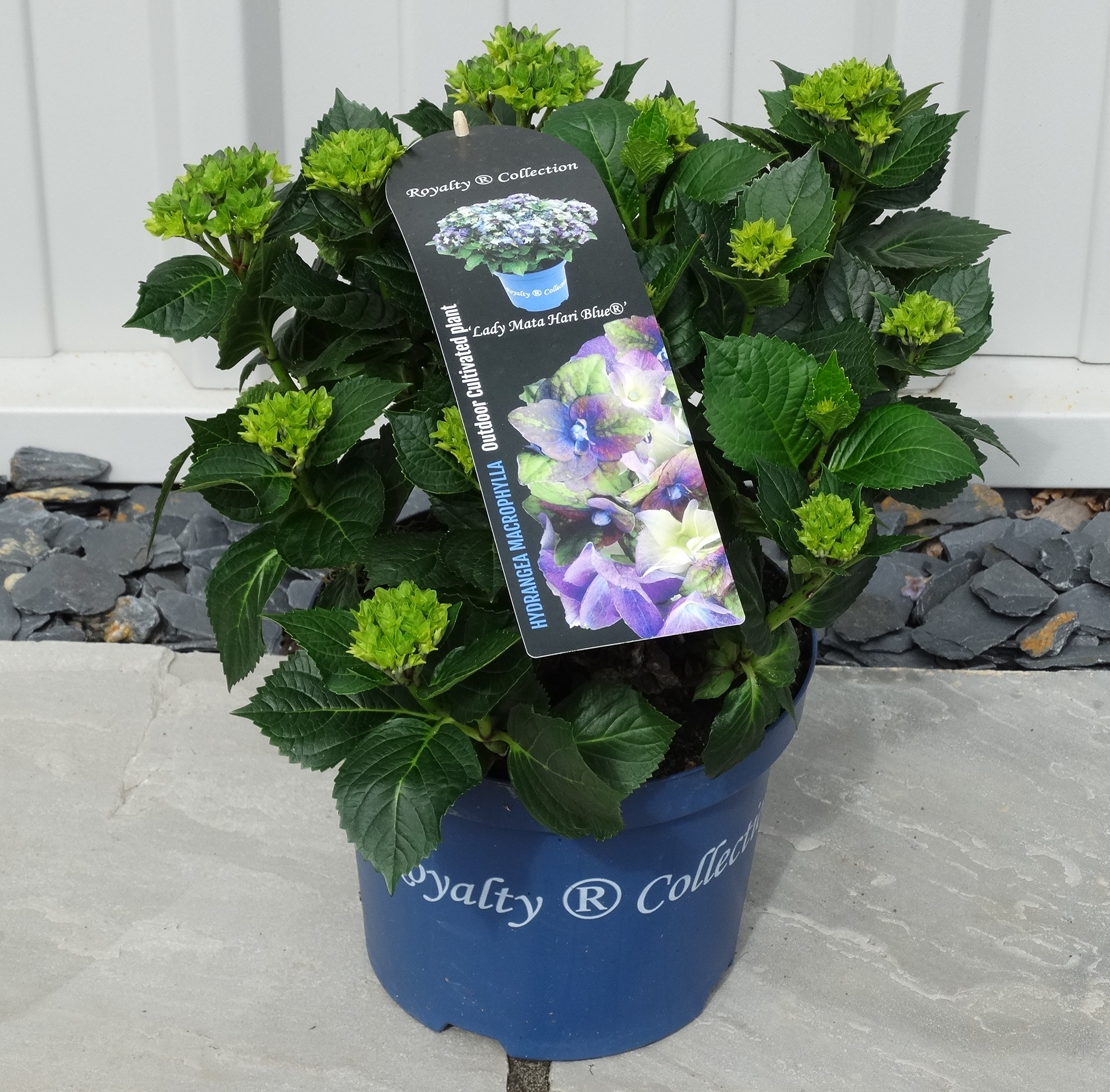 Hydrangea macrophylla ‘Lady Mata Hari Blue’ – Part of the Royalty Collection A new variety of hydrangea, a small and compact, deciduous, hardy shrub with glossy green leaves.   The mophead florets bloom in different colours from mauve-blue, pale green and creamy-white on one flower head during summer, so no two blooms are the same.  Thrives in moist fertile acid, alkaline or neutral soils, in full sun or partial shade.   To retain the deepest blue flowers throughout the season we recommend the use of Hydrangea Colourant.   Suitable for planting in pots, baskets and borders.   Remove old flower heads in spring to encourage abundant flowering.   Water frequently.   Hardiness rating H5. At certain times of the year the trees and plants that you buy from us may not look like the images shown on our website, this may be due to deciduous leaves falling, or the plant finishing flowering. All photographs on our website are of our own grown stock, or in the case of Italian specimens or bare root hedging, these are photographs of the plants actually in stock.