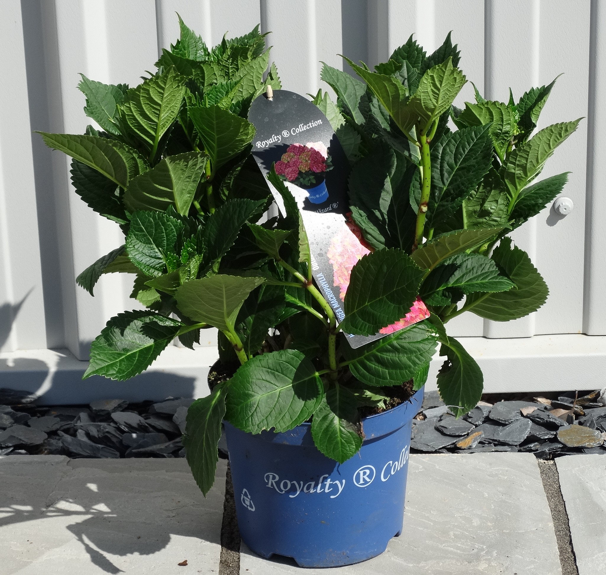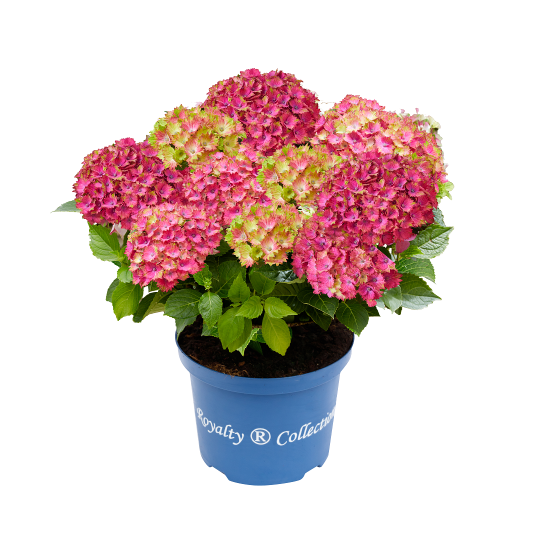 Hydrangea mac. ‘Wizard’ – Part of the Royalty Collection A new variety of hydrangea, a small and compact, deciduous, hardy shrub with glossy green leaves.   The mophead large florets have frilled edges and open deep pink with green edges, maturing to deep pink with age during summer, so no two blooms are the same.  Thrives in moist fertile acid, alkaline or neutral soils, in full sun or partial shade.  Suitable for planting in pots, baskets and borders.   Remove old flower heads in spring to encourage abundant flowering.   Water frequently.   Hardiness rating H5. At certain times of the year the trees and plants that you buy from us may not look like the images shown on our website, this may be due to deciduous leaves falling, or the plant finishing flowering. All photographs on our website are of our own grown stock, or in the case of Italian specimens or bare root hedging, these are photographs of the plants actually in stock.