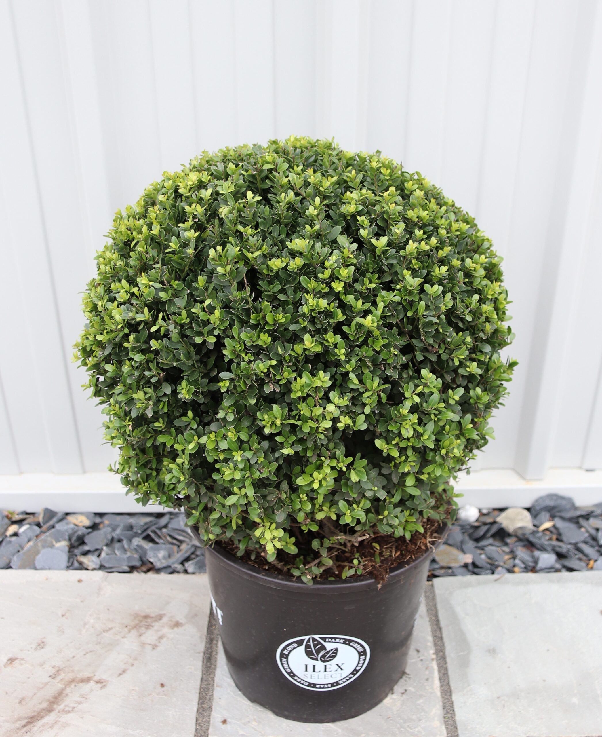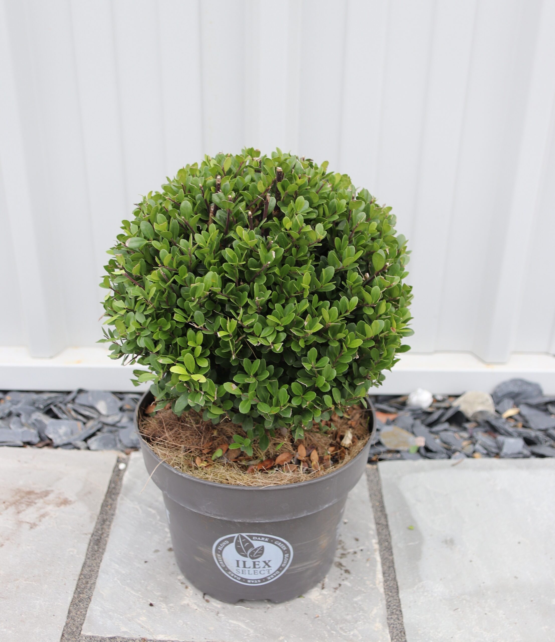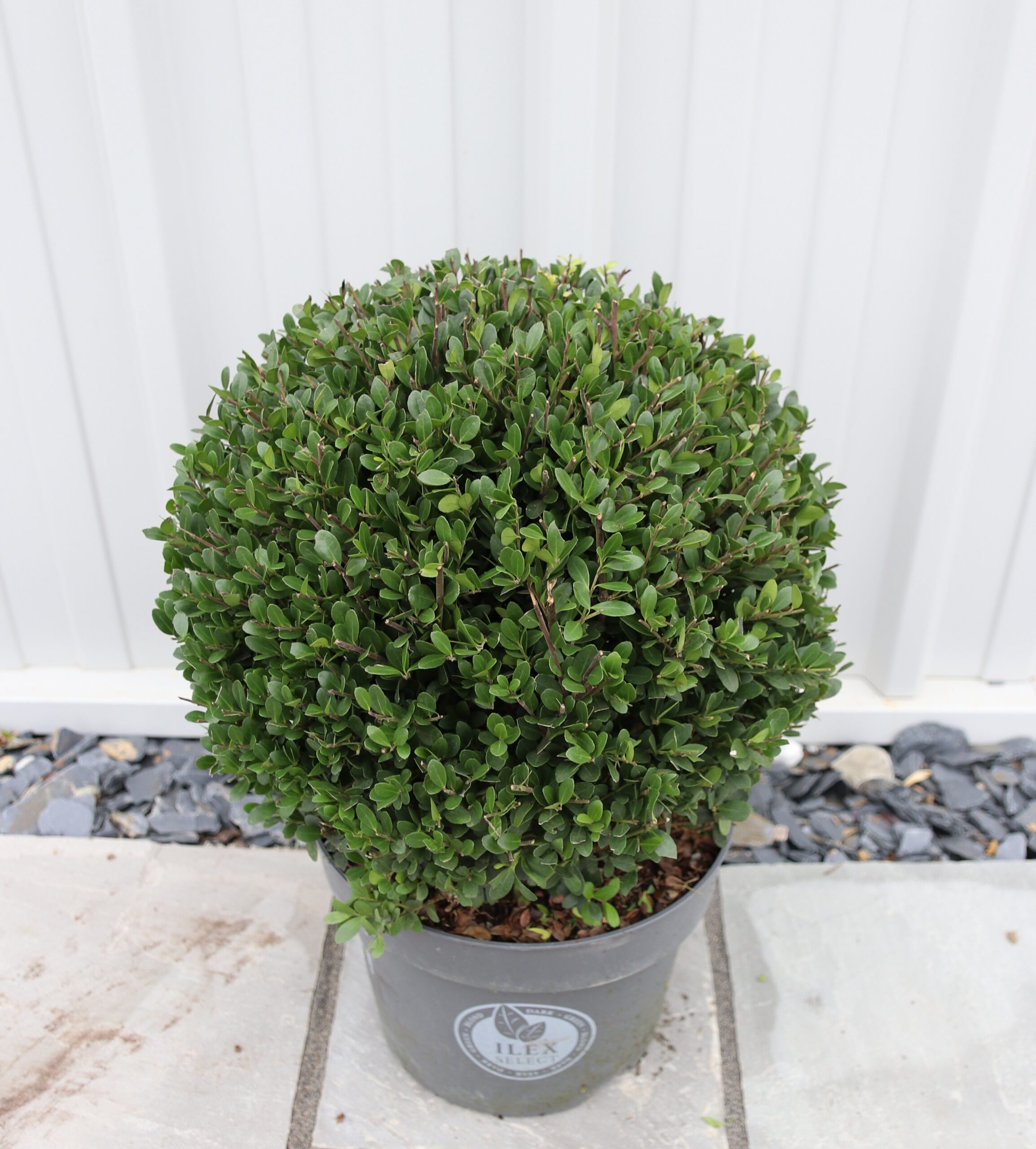 Japanese holly: An evergreen shrub or small tree of slow growth, reaching around 4 meters in 10-20 years, with small, glossy dark green leaves up to 2cm long. Clusters of small white flowers appear in spring followed by black berries in autumn. This is an excellent plant for small, clipped hedges and topiary, and is now regularly planted as a substitute for box. Plant in moist, well drained acid, alkaline or neutral soil, in full sun or partial shade. Hardiness rating H6.