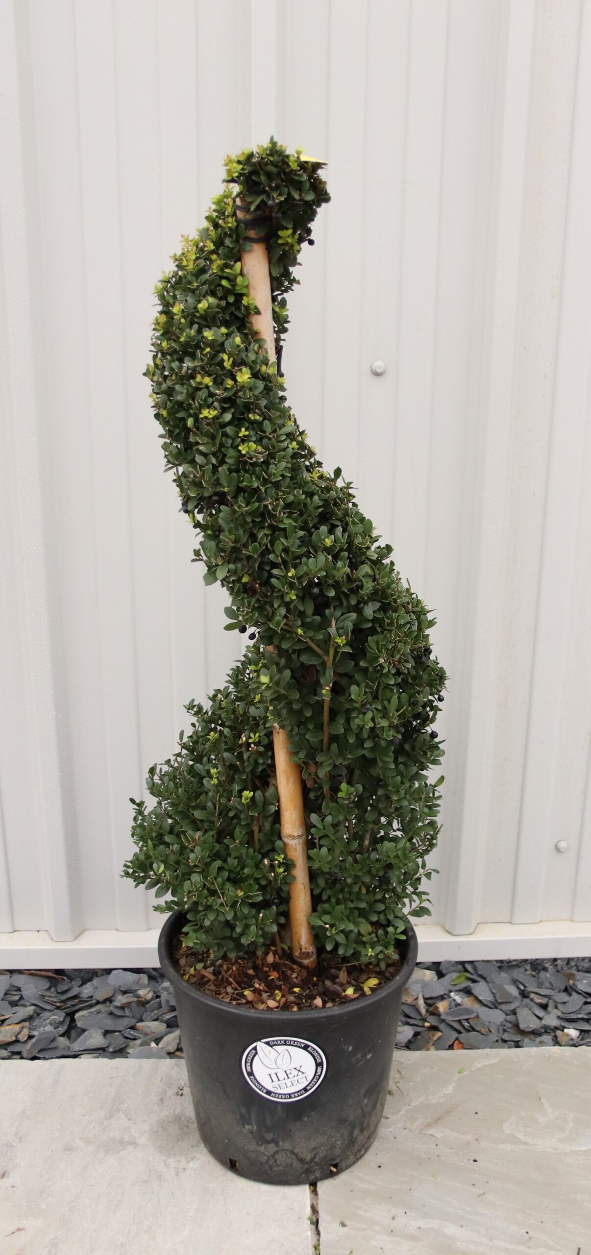 Japanese holly:   An evergreen shrub or small tree of slow growth, reaching around 4 meters in 10-20 years, with small, glossy dark green leaves up to 2cm long.   Clusters of small white flowers appear in spring followed by black berries in autumn.   This is an excellent plant for small, clipped hedges and topiary, and is now regularly planted as a substitute for box.   Plant in moist, well drained acid, alkaline or neutral soil, in full sun or partial shade.   Hardiness rating H6.