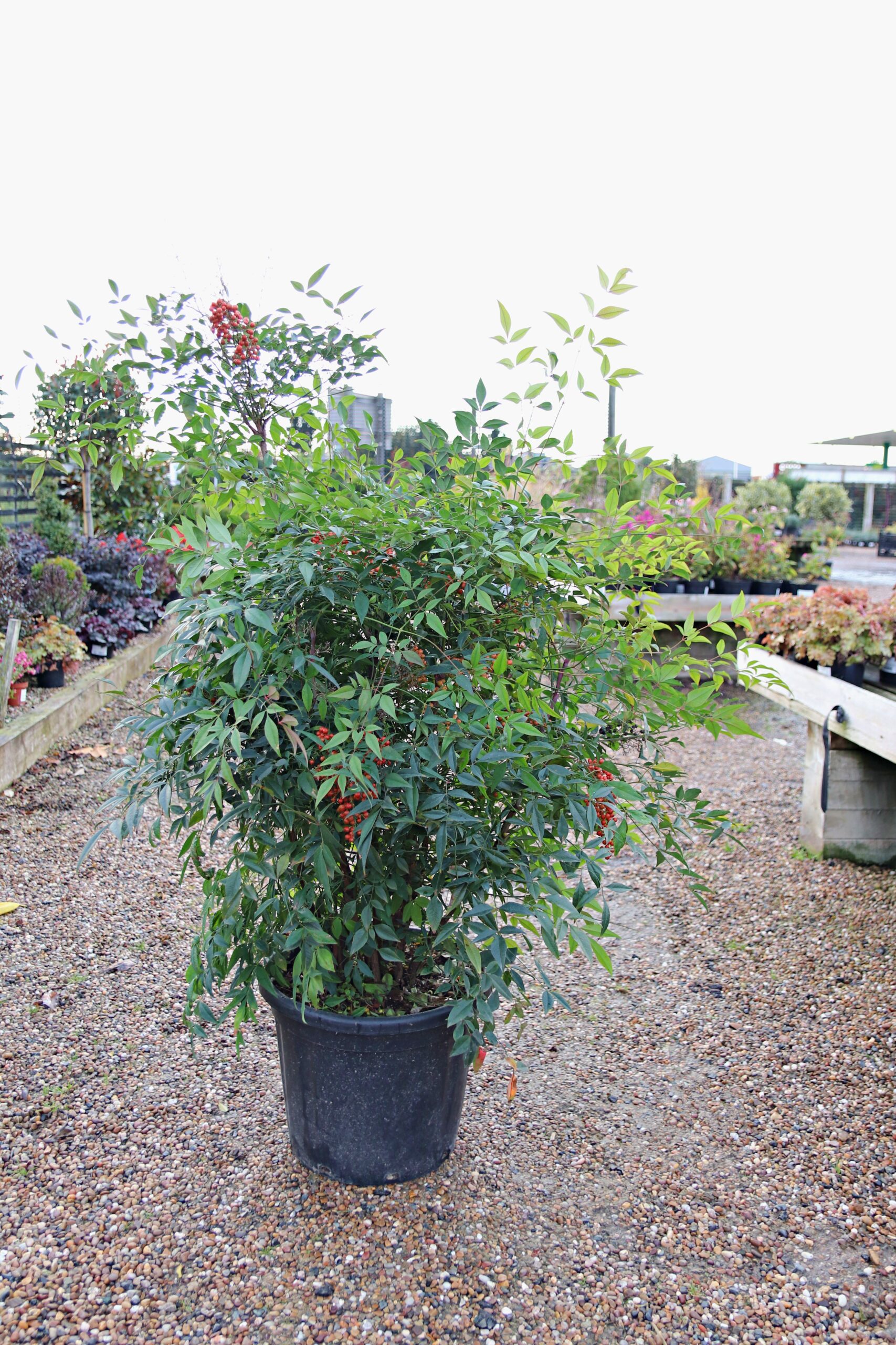 Sacred bamboo – Heavenly bamboo: a medium sized, elegant, upright, evergreen shrub with a bamboo-like habit, up to around 2m high.   The large compound green leaves and lanceolate leaflets are tinged purplish red in spring and autumn.   Small white flowers are borne in long terminal panicles in summer, followed by red or sometimes yellow or white berries.   Plant in moist well drained acid, alkaline or neutral soil in full sun.   Hardiness rating H5.