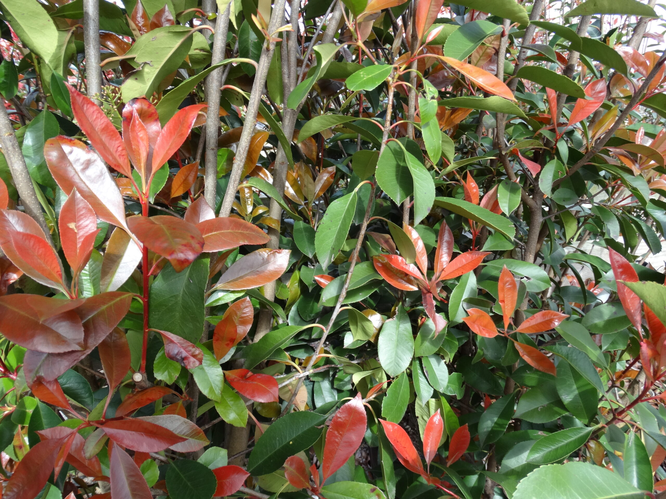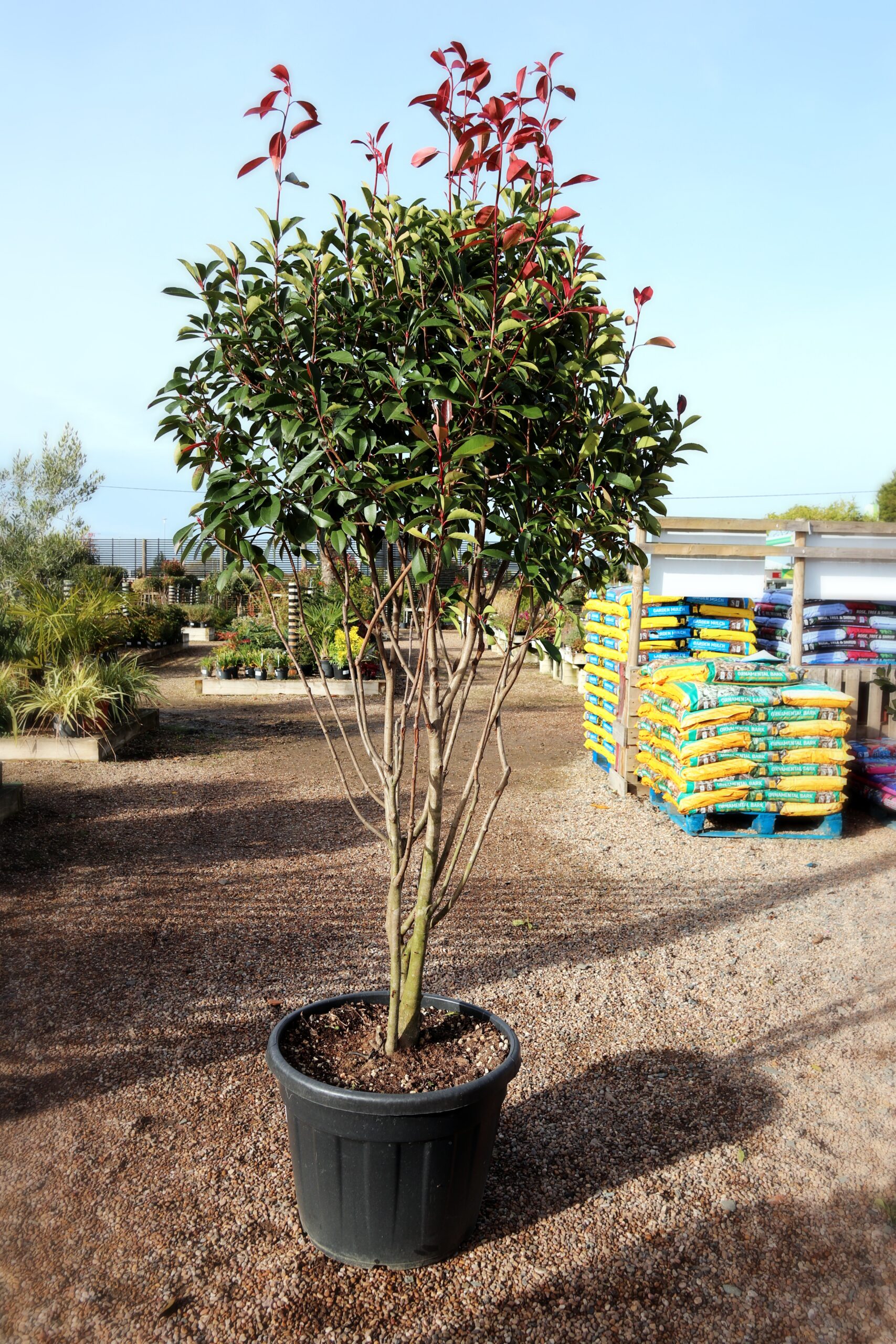 Red Robin - A large, vigorous, evergreen shrub or small tree with dark glossy green, elliptic, leathery leaves up to 10cm in length. Brilliant red young growths are produced in early spring, maturing to dark green with age. Clusters of creamy-white flowers appear in spring if the plant is left unpruned. Ideal for evergreen hedging, or individual specimens, in bush or tree form. Plant in moist, well drained soils, avoiding clay. Hardiness rating H5.