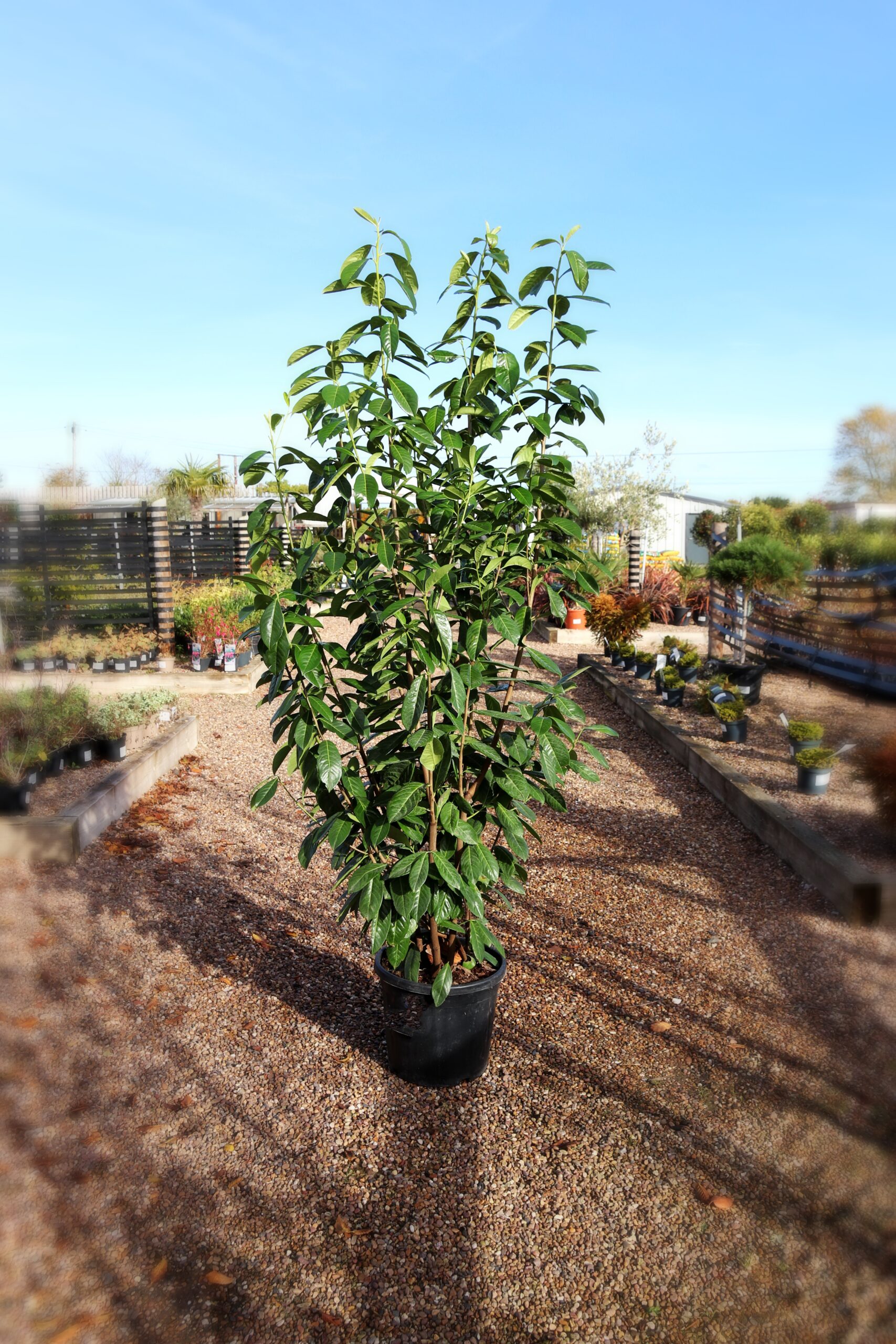 Cherry laurel - A vigorous evergreen shrub of dense, bushy habit, with large, glossy leaves, which can become tree-like up to 5m tall if not pruned.   Upright spikes of small white flowers are produced in spring, followed by clusters of shiny, dark red to black berries.   Plant in full sun or partial shade, in moist, well drained soil.   Drought resistant when established.   Hardiness rating H6.