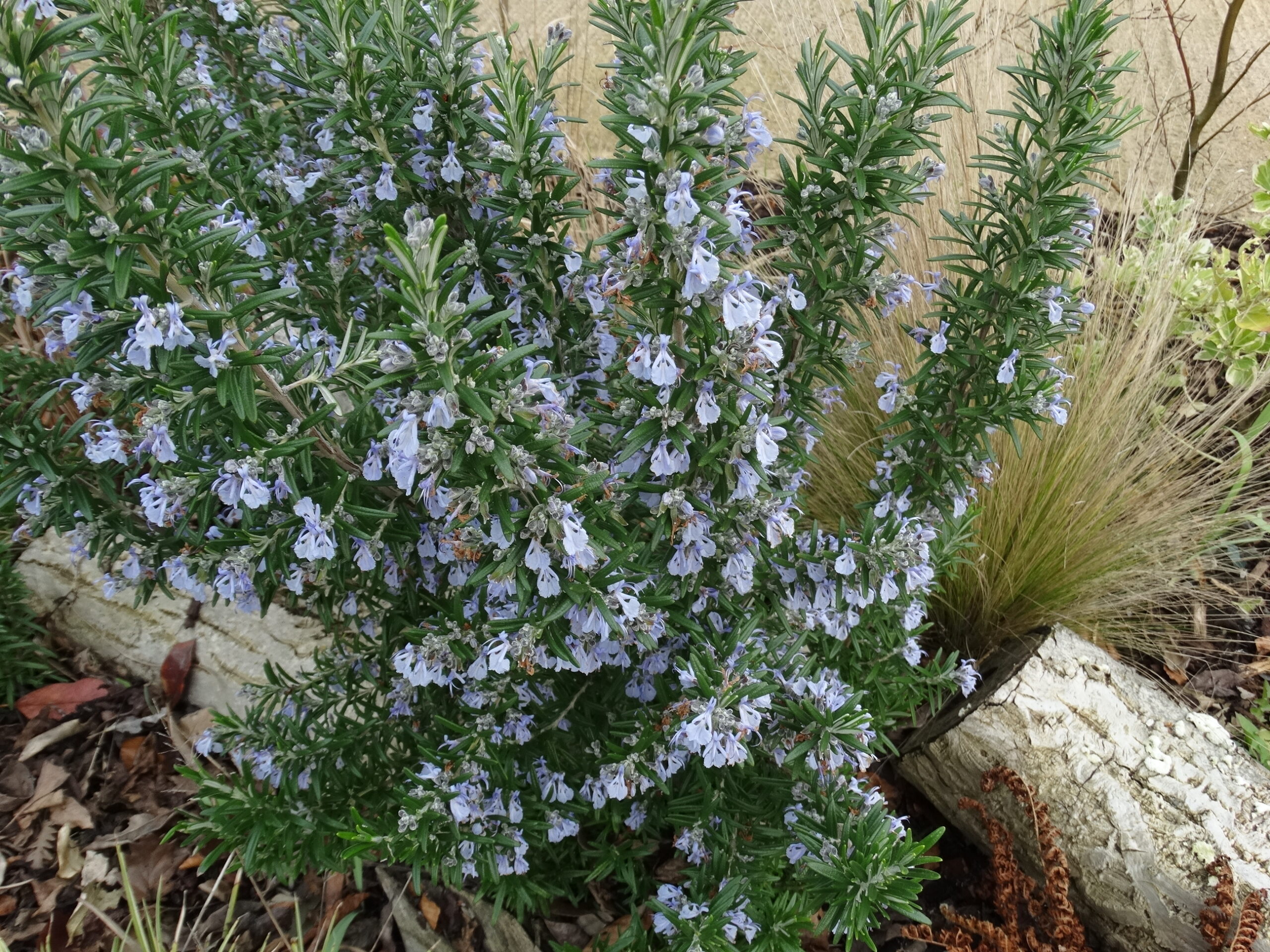 Rosemary: A strong growing, bushy, upright, evergreen shrub to about 2m high, with narrow, linear, aromatic dark green leaves which are whitish beneath. Numerous, small, light blue flowers are produced in spring and summer, along the previous year’s branches. This plant will provide nectar and pollen for bees and other pollinating insects. Will make an attractive informal hedge if lightly pruned. Plant in well drained acid, alkaline or neutral soil in full sun. Hardiness rating H4.