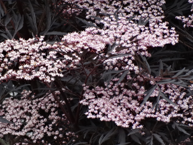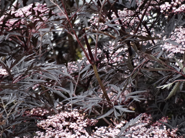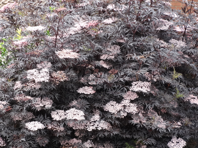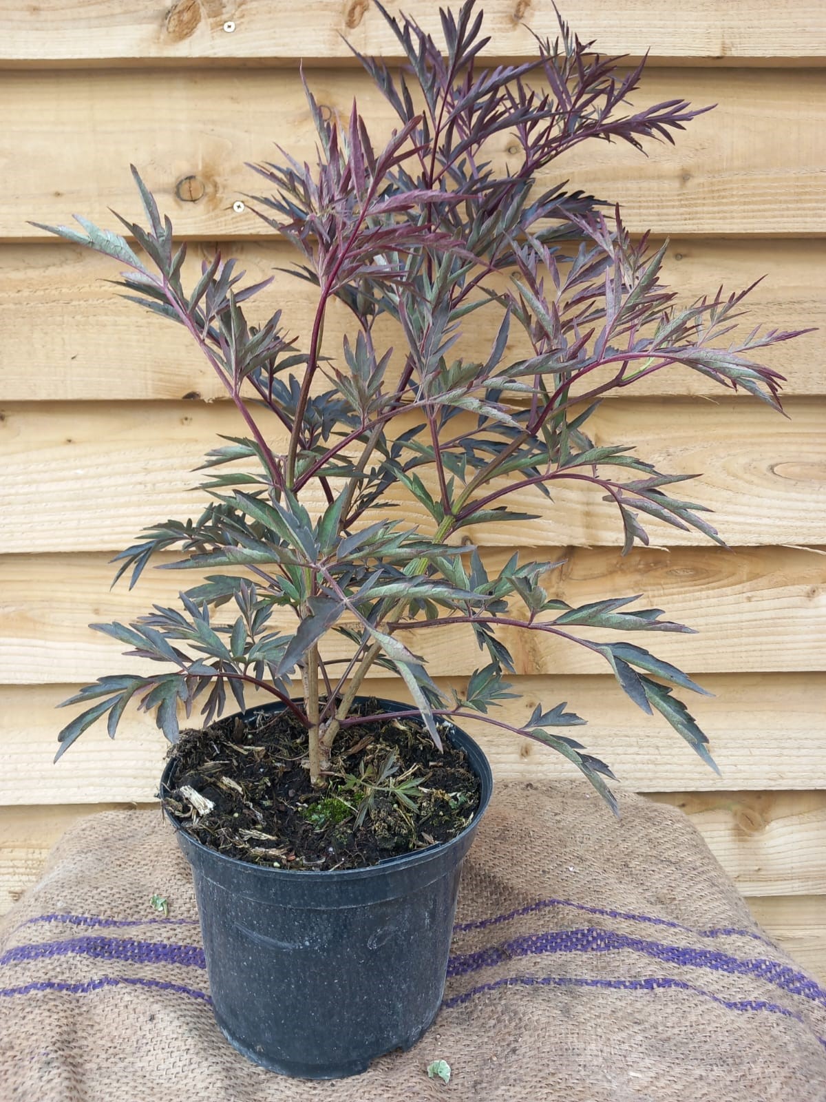 Purple Elderflower - A medium sized shrub up to 3m, with very deeply cut leaflets which give a distinctive lacy effect. Large flat heads of tiny pinkish flowers are borne abundantly in summer, and may be followed by purple-black berries. The flowers have a distinctive grape scent of elder flowers. Both the fruit and flowers may be used for flavouring drinks. Plant in full sun or partial shade in moist well drained soils. Will grow in extremely chalky soils. Hardiness rating H6.