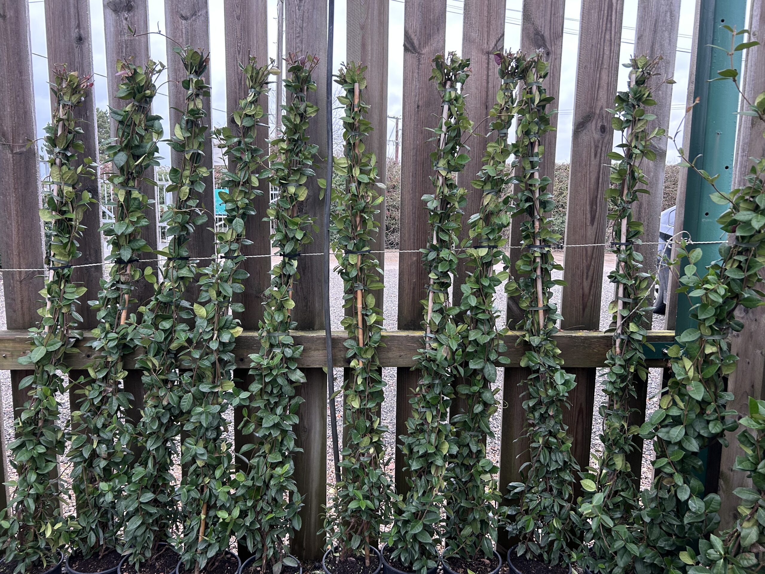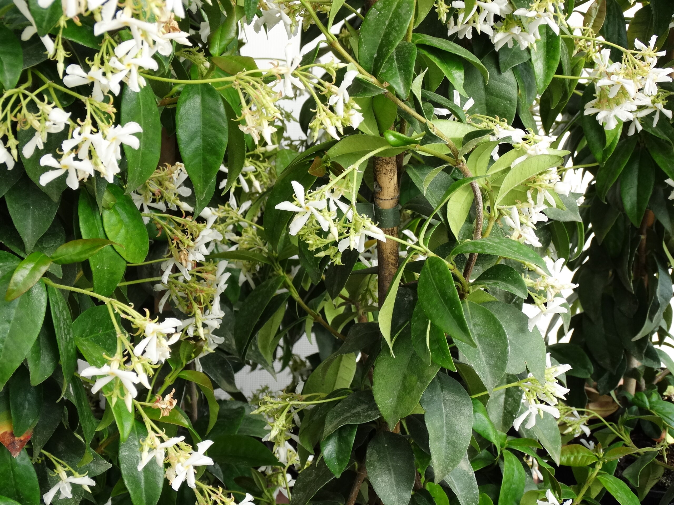 Star Jasmine - A beautiful, evergreen, slow growing climber reaching up to 7m high and similarly across.   Dark, polished leaves 5-7.5cm long often turn bronze-red in winter.   Very fragrant white flowers, 2.5cm across, becoming cream with age, are produced from June to August.   Requires a warm sheltered wall, in full sun or partial shade, in well drained, moist soil, avoiding clay.   Hardiness rating H4.
