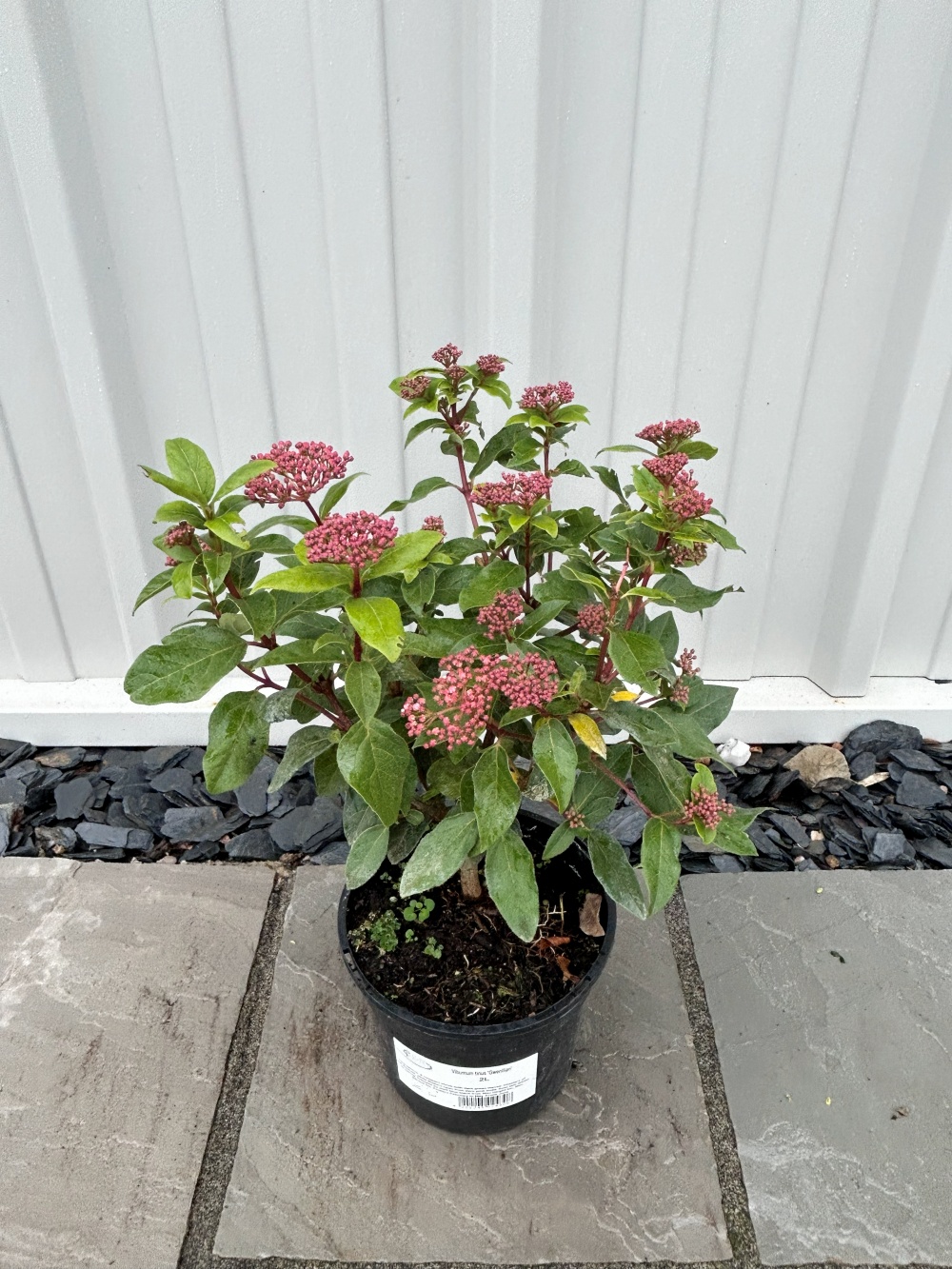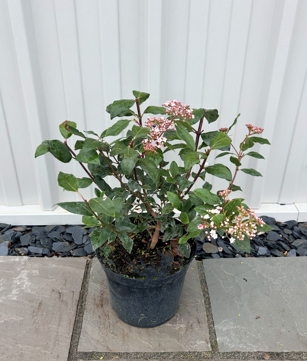 Viburnum tinus ‘Gwenllian’ Laurustinus Gwenllian:  On of the most popular, compact, medium sized evergreen shrubs, with masses of dark, glossy green oval leaves.   Clusters of flowers which are a rich, deep pink in bud, opening to white, flushed pink are produced in late winter, which are attractive to bees and other pollenating insects, followed by metallic-blue berries.   This plant has many forms; as a shrub it is lovely as an individual, or can be used for hedging, and is also grown as a half standard for a more formal look.   Plant in moist, well drained acid, alkaline or neutral soil, in full or partial shade or full sun.   Hardiness rating H4.