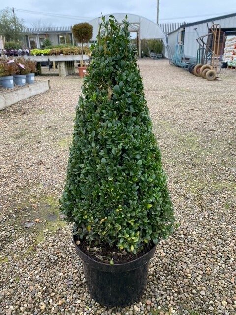 'Common Box' - A large evergreen shrub often used for hedging or topiary, with glossy, dark green leaves. Clusters of small, yellowish flowers are produced in spring. Thrives in all types of moist well drained soils, preferably in full or partial shade. Hardiness rating H6.