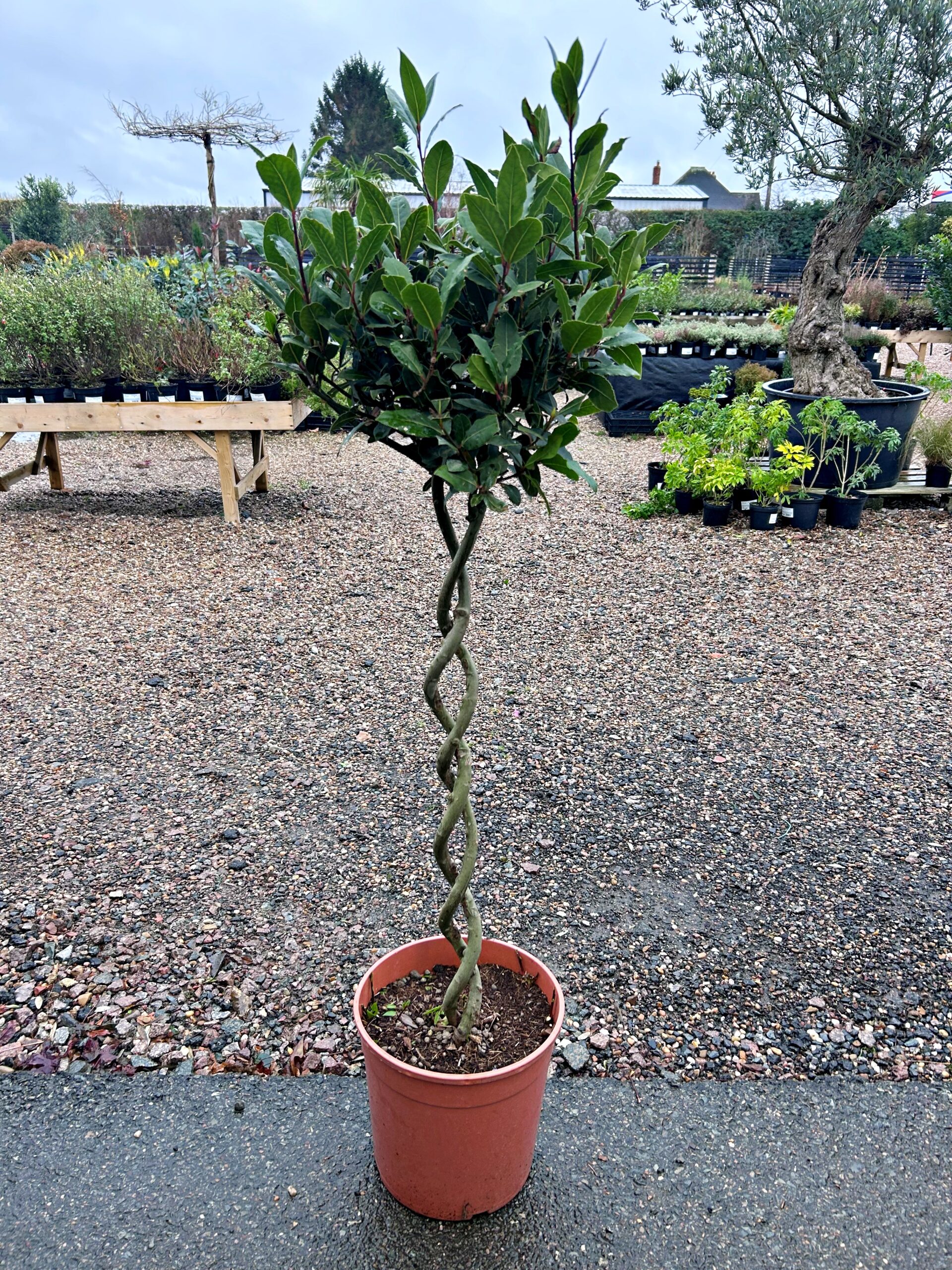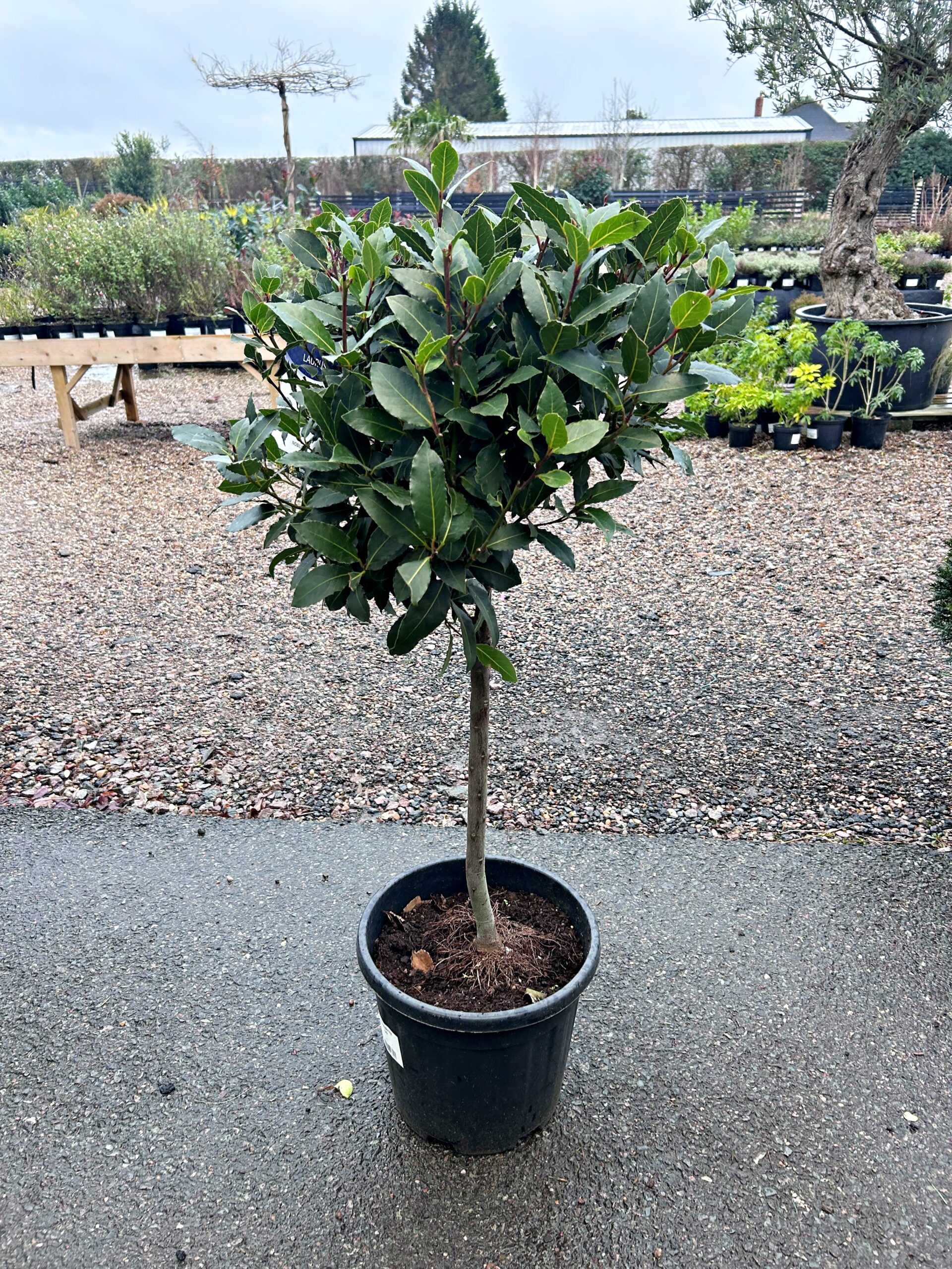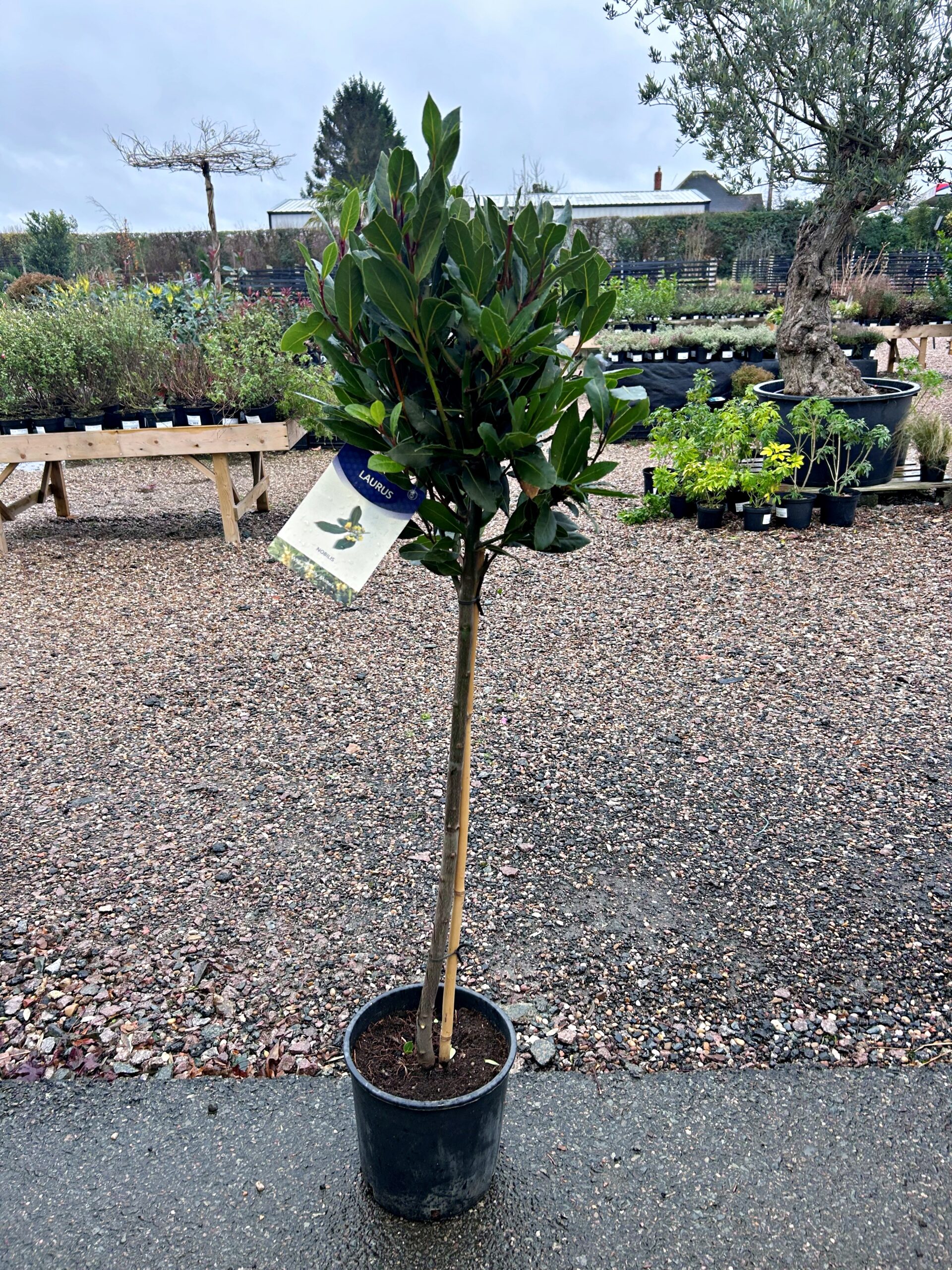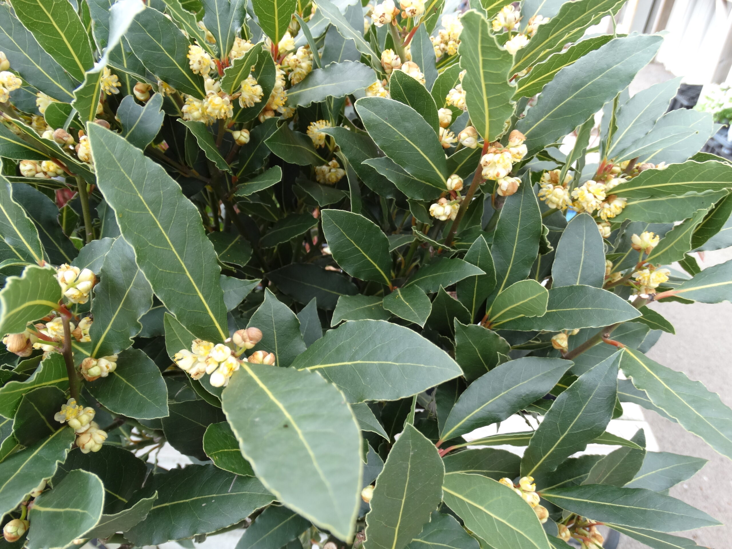 Laurus nobilis Bay Tree: A large, evergreen shrub of erect habit, with aromatic, leathery, glossy, dark green, narrowly ovate leaves up to 10cm long.   The dried or fresh leaves are often used for culinary purposes.   Small pale, greenish-yellow flowers are produced in spring, followed by oval berries 1.5cm in diameter, turning glossy black when ripe.   Tolerates clipping well and thrives in coastal areas, but can be subject to frost damage in cold areas.   Plant in moist, well drained acid, alkaline or neutral soil in full sun or partial shade.   Hardiness rating H4.