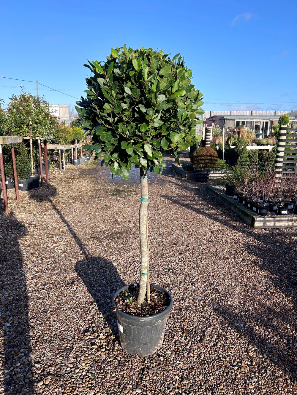 Laurus nobilis Bay Tree: A large, evergreen shrub of erect habit or small tree, with aromatic, leathery, glossy, dark green, narrowly ovate leaves up to 10cm long.   The dried or fresh leaves are often used for culinary purposes.   Small pale, greenish-yellow flowers are produced in spring, followed by oval berries 1.5cm in diameter, turning glossy black when ripe.   Tolerates clipping well and thrives in coastal areas, but can be subject to frost damage in cold areas.   Plant in moist, well drained acid, alkaline or neutral soil in full sun or partial shade.   Hardiness rating H4.