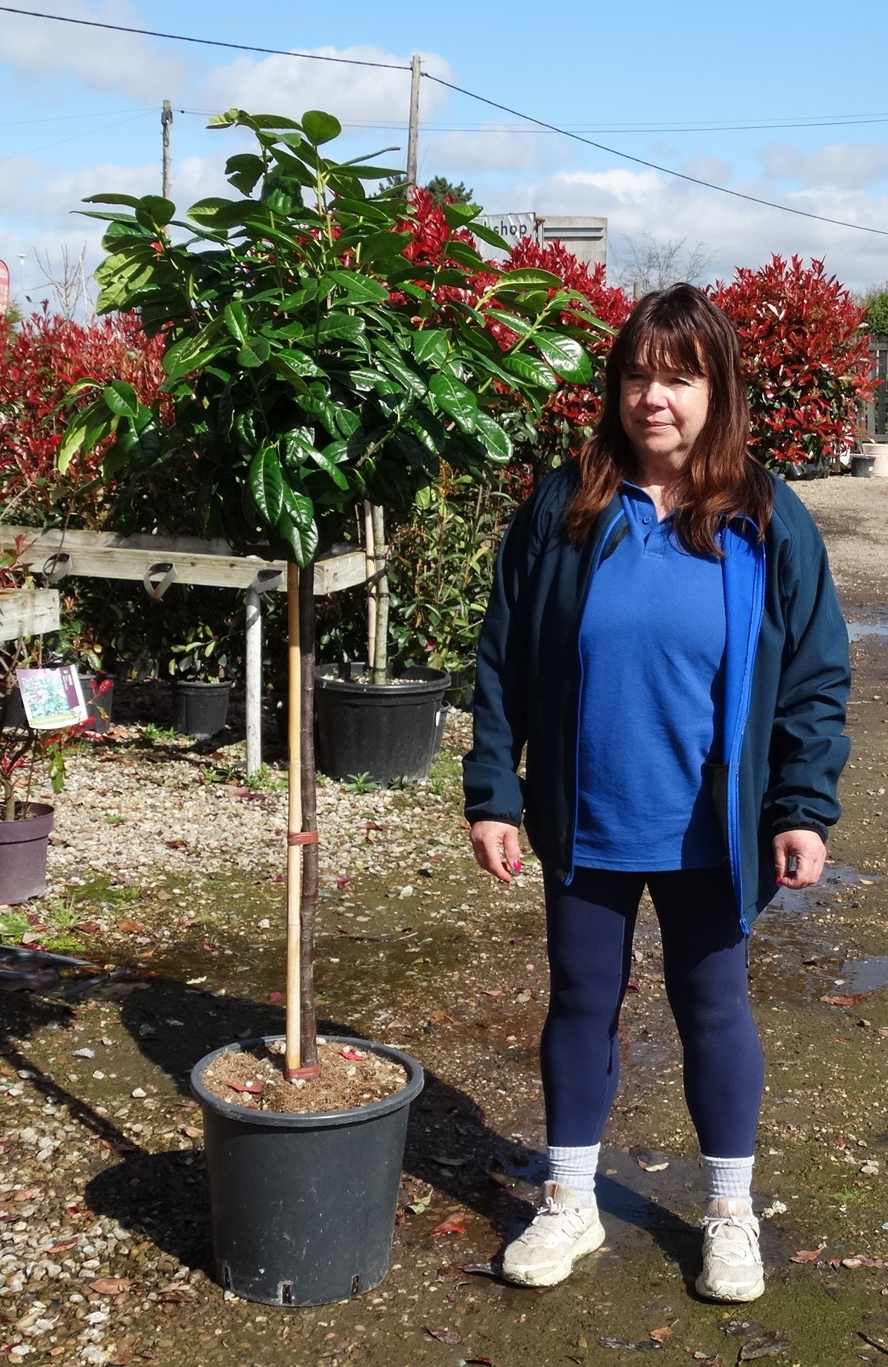 Prunus laurocerasus ‘Novita’ Cherry laurel - A vigorous evergreen shrub of dense, bushy habit, with large, glossy leaves, which can become tree-like up to 5m tall if not pruned.   Upright spikes of small white flowers are produced in spring, followed by clusters of shiny, dark red to black berries.   Plant in full sun or partial shade, in moist, well drained acid to neutral soil.   Drought resistant when established.   Hardiness rating H6. At certain times of the year the trees and plants that you buy from us may not look like the images shown on our website, this may be due to deciduous leaves falling, or the plant finishing flowering. All photographs on our website are of our own grown stock, or in the case of Italian specimens or bare root hedging, these are photographs of the plants actually in stock.