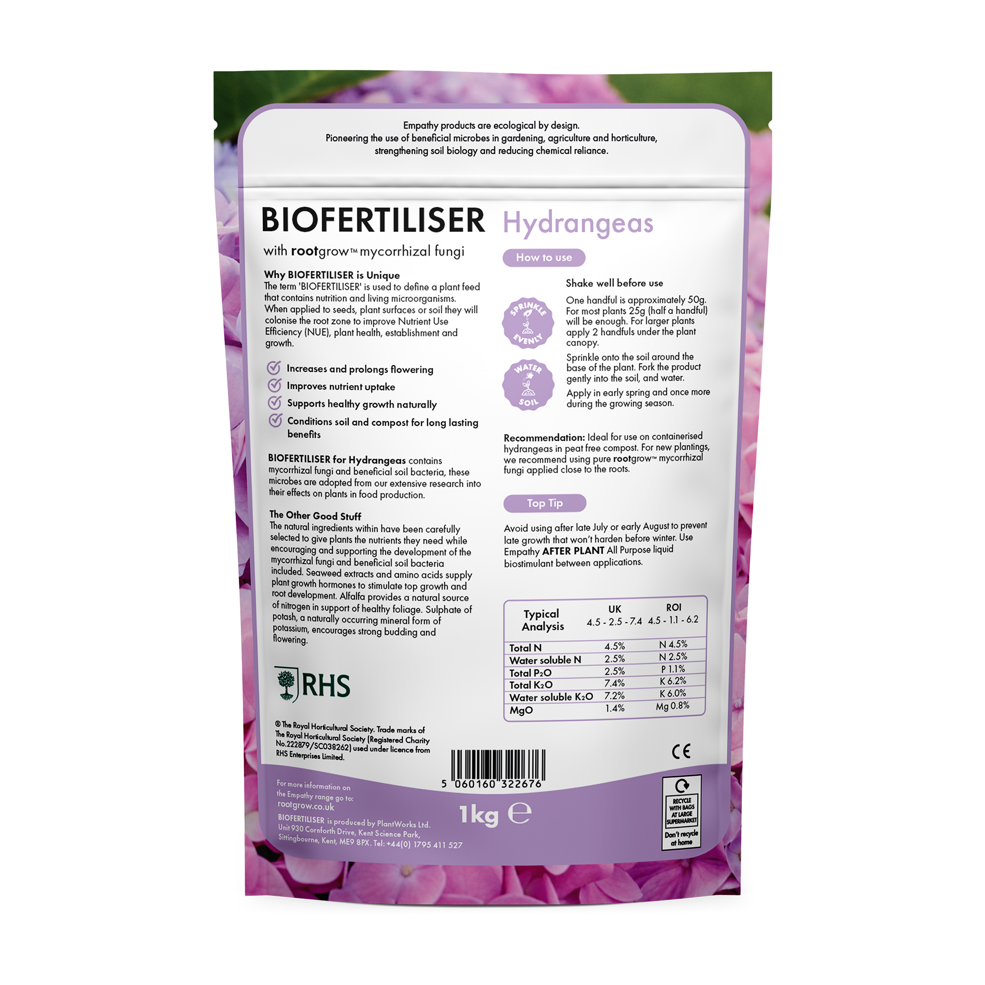 Empathy Biofertiliser for Hydrangeas contains mycorrhizal fungi and beneficial soil bacteria.   The natural ingredients within have been carefully selected to give plants they need while encouraging and supporting the development of the mycorrhizal fungi and beneficial soil bacteria including seaweed extracts and amino acids supply plant growth and root development.   Alfalfa provides a natural source of nitrogen in support of healthy foliage.   Sulphate of Potash, a naturally occurring mineral form of potassium, encourages strong budding and flowering. Ideal for containerised plants.   For new plantings, we recommend using pure rootgrow mycorrhizal fungi applied close to the roots. TOP TIP: Avoid using after late July or early August to prevent late growth that won’t harden before winter.