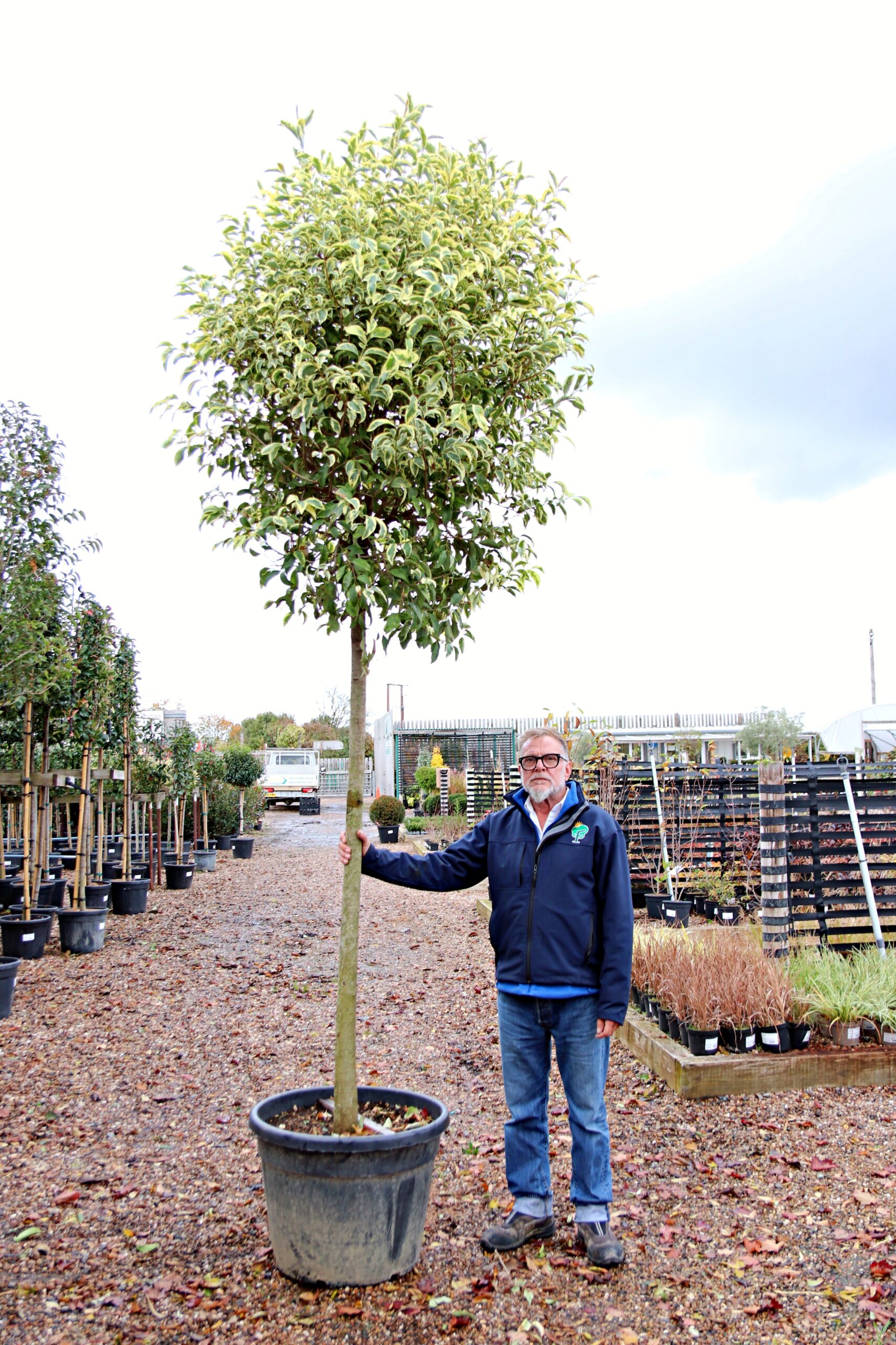 Chinese privet - A very striking large, evergreen shrub or small to medium sized tree, with bright green leaves, which are mottled with pale green and edged yellow or yellowish green.   Small cream panicles of cream flowers up to 2ocm in length, are produced in late summer and early autumn, followed by black berries.   Plant in all types of moist, well drained soil in full sun or partial shade. Hardiness rating H5. We would advise that you will also need a stake, tie and Mona Relief watering system with this tree. At certain times of the year the trees and plants that you buy from us may not look like the images shown on our website, this may be due to deciduous leaves falling, or the plant finishing flowering. All photographs on our website are of our own grown stock, or in the case of Italian specimens, these are photographs of the plants actually in stock. As this is a large tree we will only be able to arrange delivery for post codes within a 50 mile radius of NG13 8JA.   Please call 01949 21402 for a delivery charge quotation.
