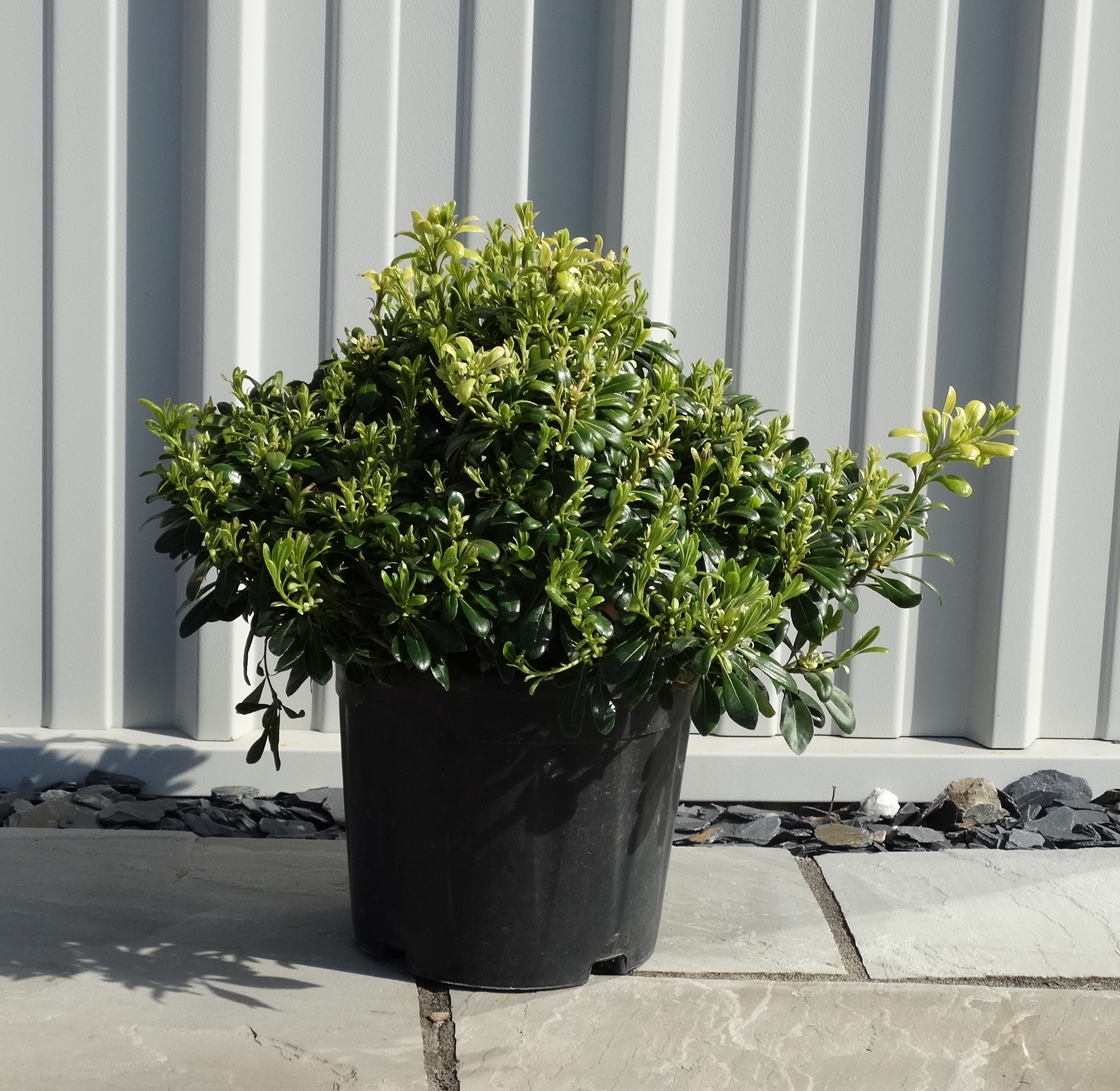 Pittosporum tobira ‘Nanum’ A small, slow growing, dense, evergreen, eventually making a large mound forming shrub up to about 1m high.   Bright, glossy green obovate leaves form whorls.   Orange-blossom-scented, creamy white flowers are produced in summer, eventually turning yellow.   An excellent patio plant.    Plant in full sun or partial shade in a sheltered position, in moist, well drained soil, avoiding clay.   Protect from cold, drying winds.   Hardiness rating H3. At certain times of the year the trees and plants that you buy from us may not look like the images shown on our website, this may be due to deciduous leaves falling, or the plant finishing flowering. All photographs on our website are of our own grown stock, or in the case of Italian specimens or bare root hedging, these are photographs of the plants actually in stock.
